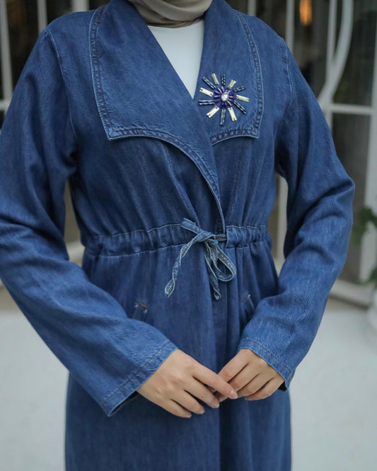 Beli Bağcıklı Yakası Taşlı Kot Kap Koyu Mavi
