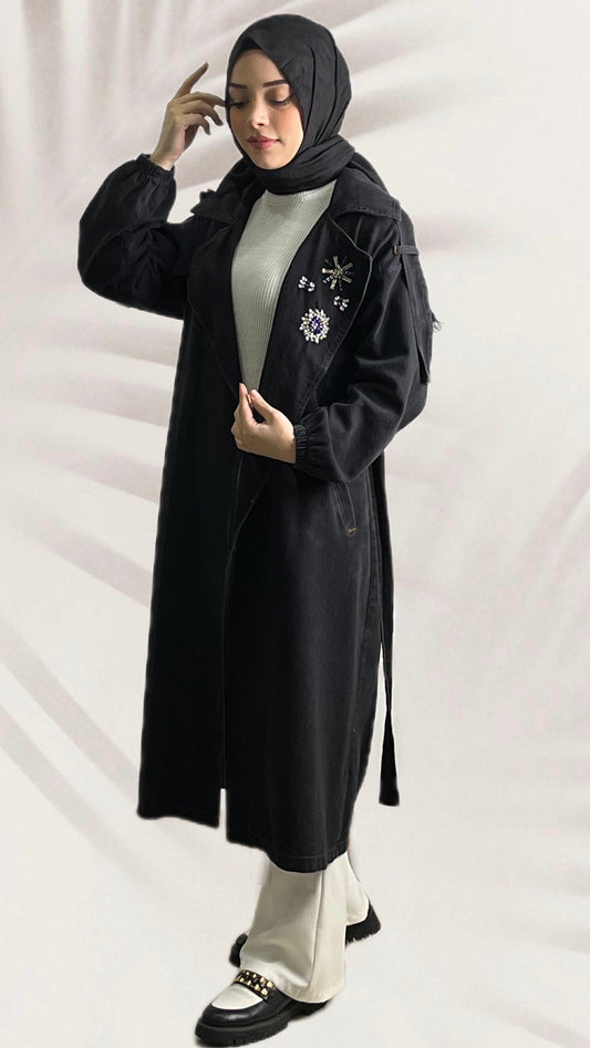 Apeletli Yaka Taşlı Kot Kap Siyah