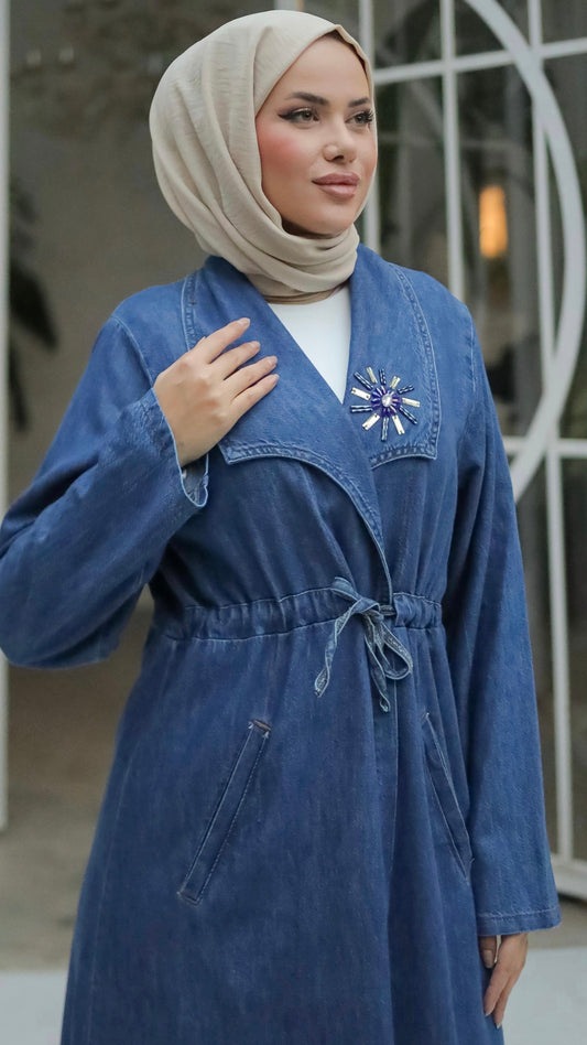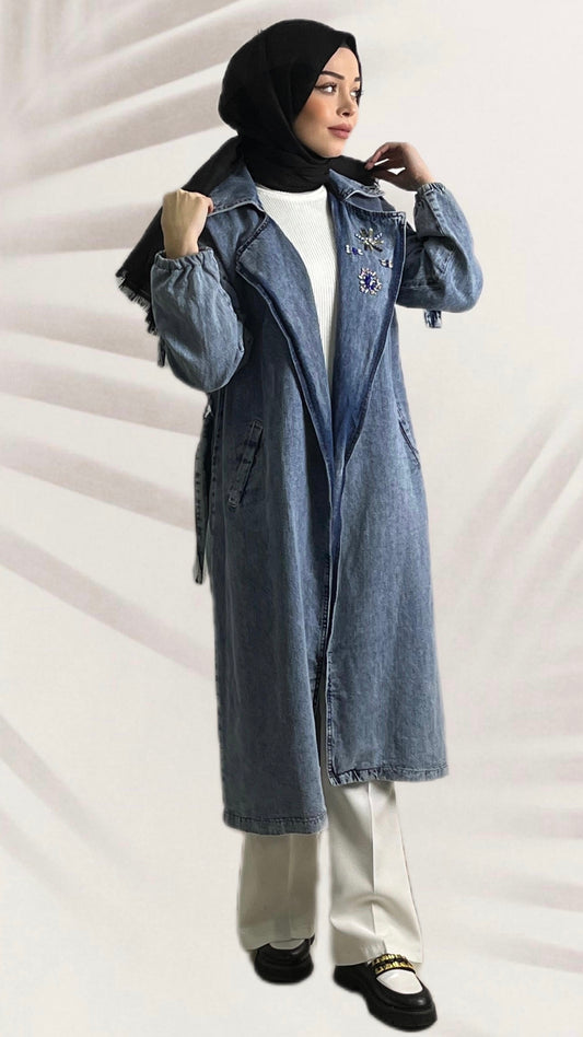 Beli Bağcıklı Yakası Taşlı Kot Kap Açık Mavi