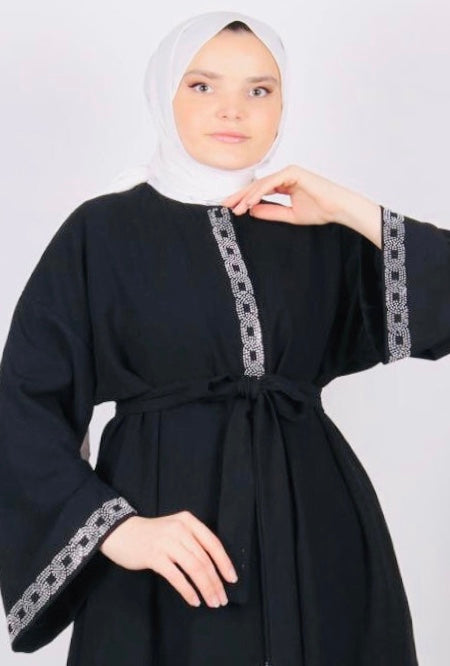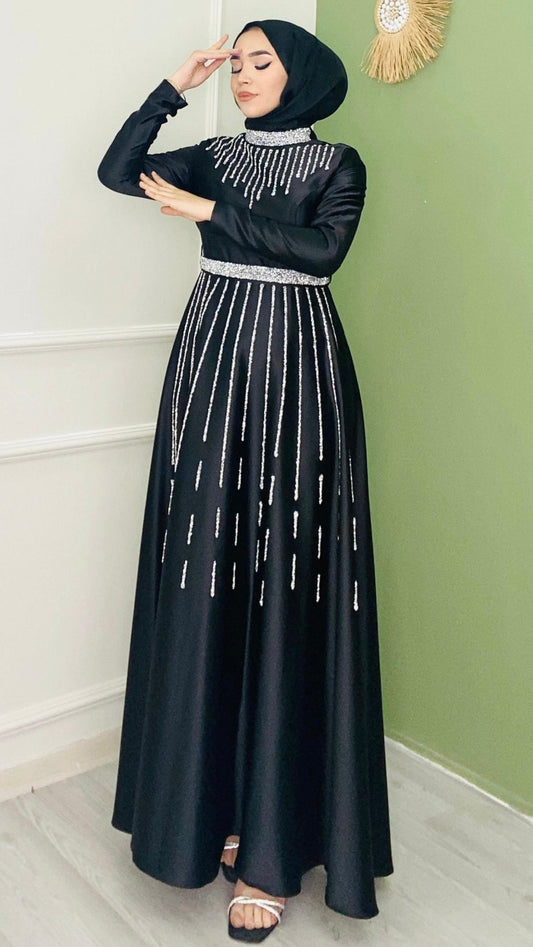 Boğazı Taşlı Dikey Taş Tasarımlı Abiye Siyah