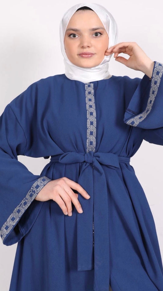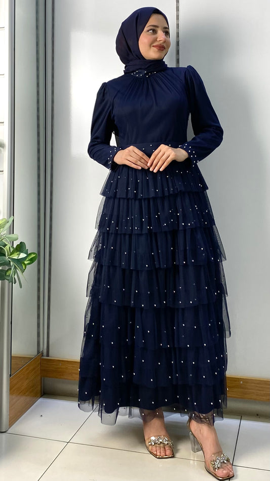 İnci İşlemeli Eteği Kat Kat Elbise Lacivert