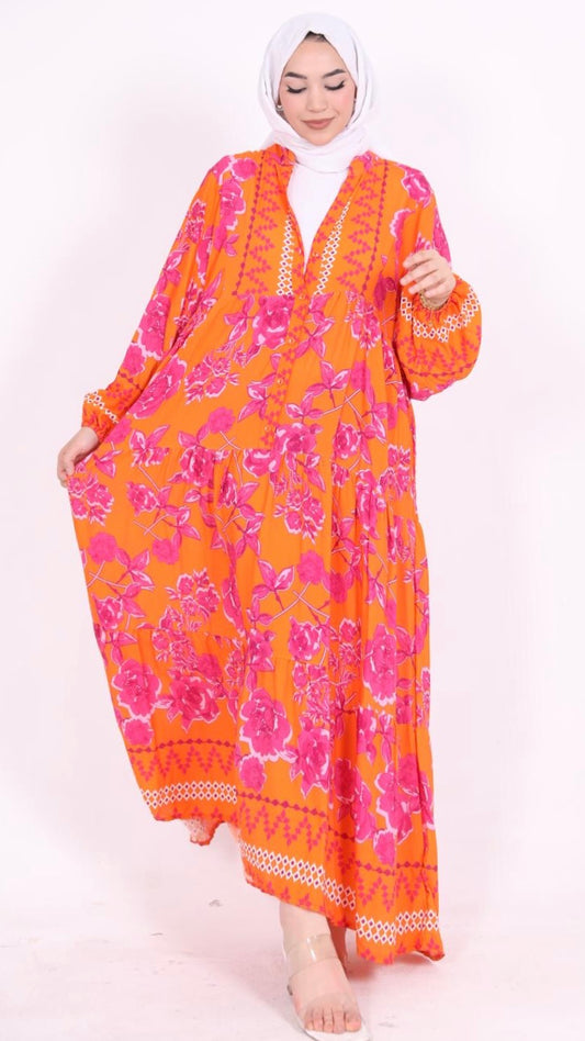 Yaprak Desenli Astarlı Saten Elbise Pembe