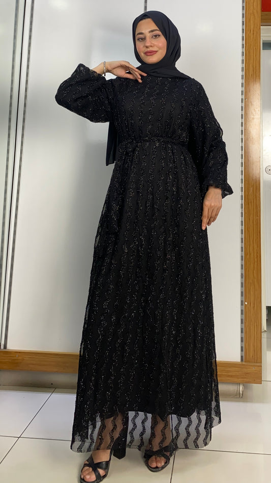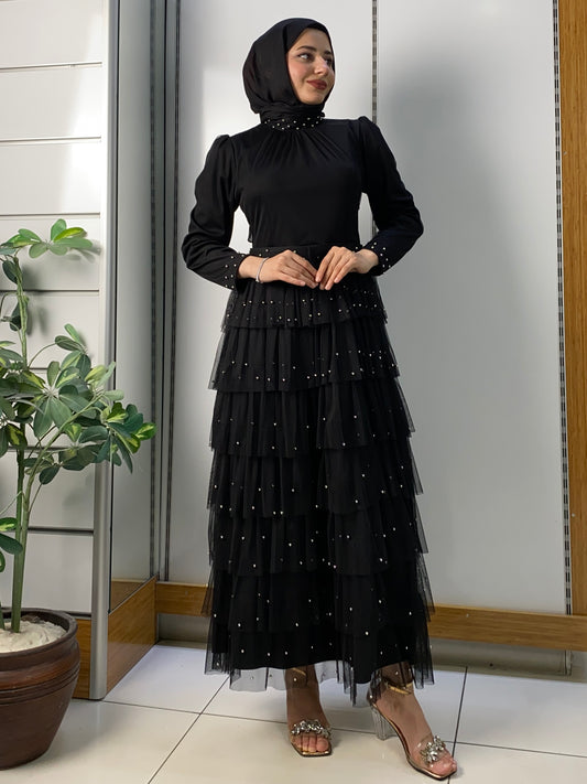 İnci İşlemeli Eteği Kat Kat Elbise Siyah