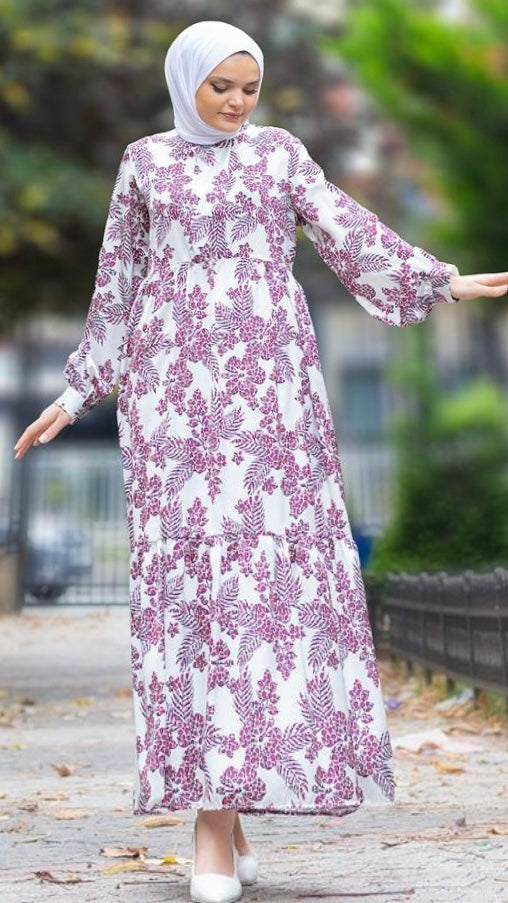 Yaprak Desenli Astarlı Saten Elbise Mor