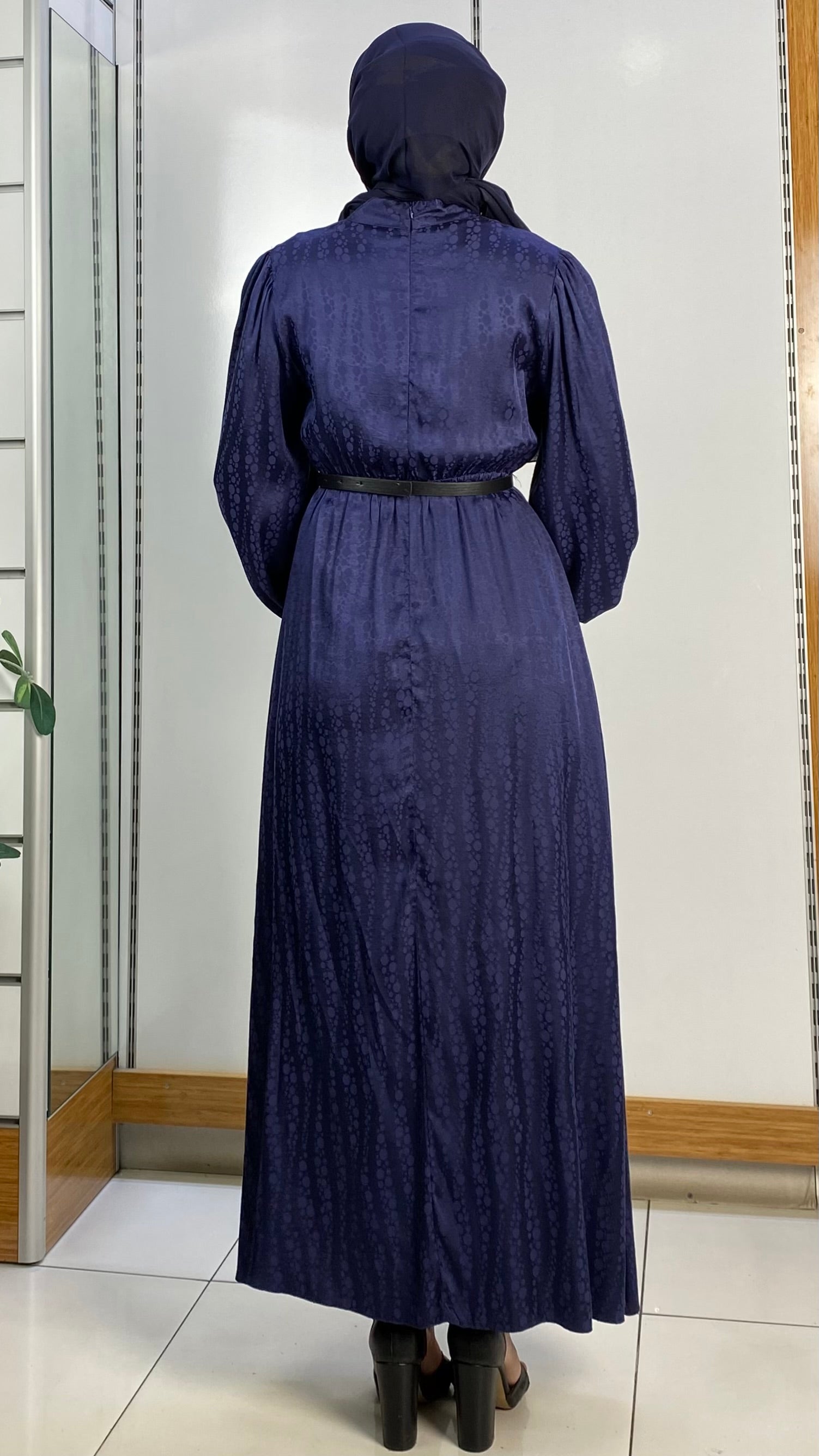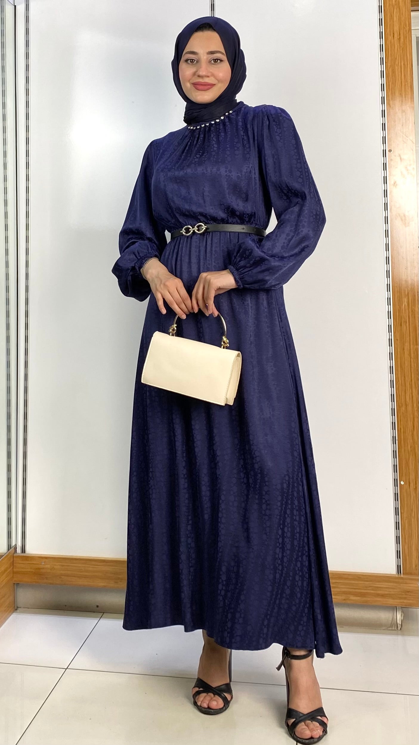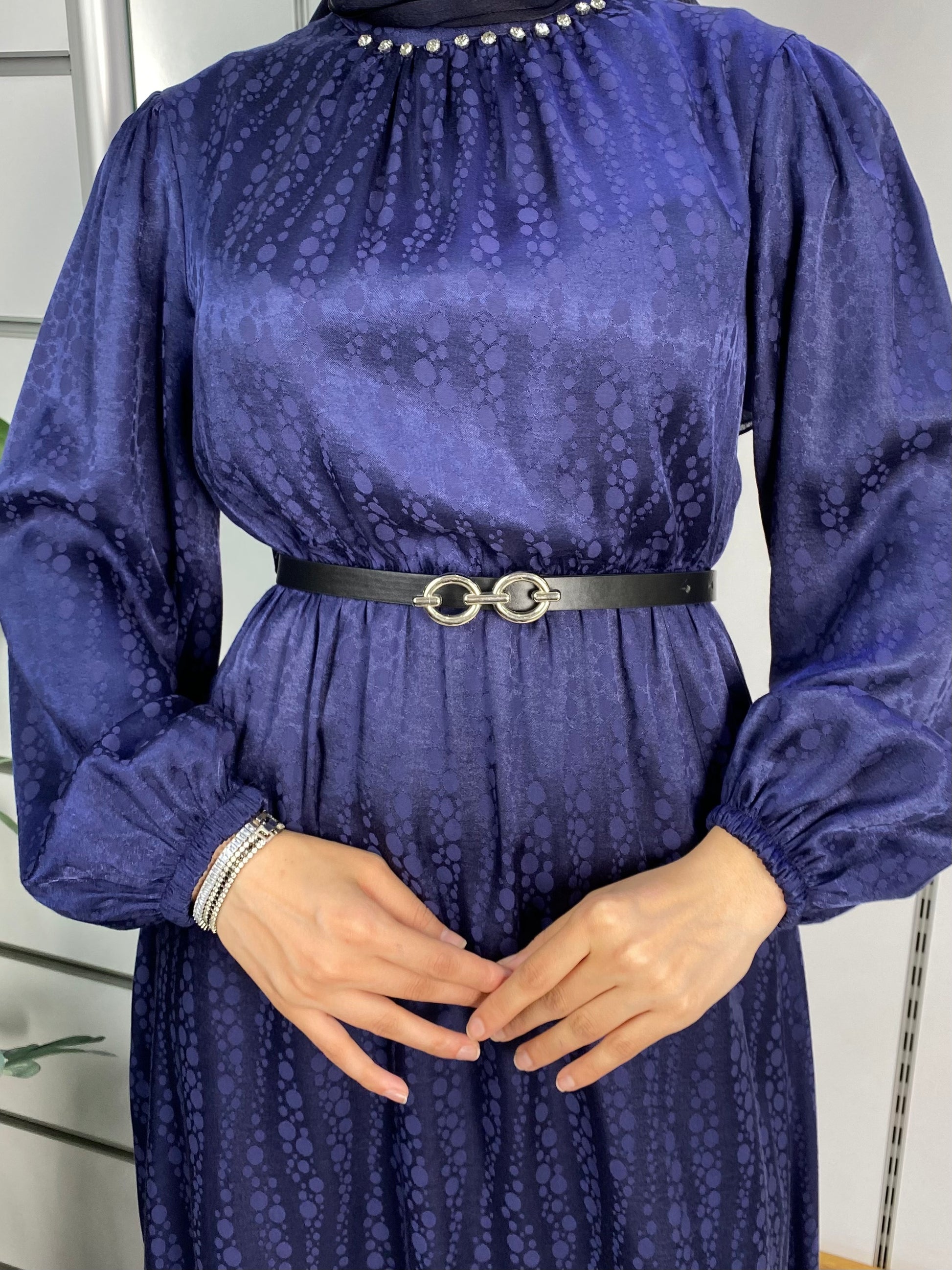 Boğazı Taşlı Beli Lastik ve Kemerli Elbise Lacivert