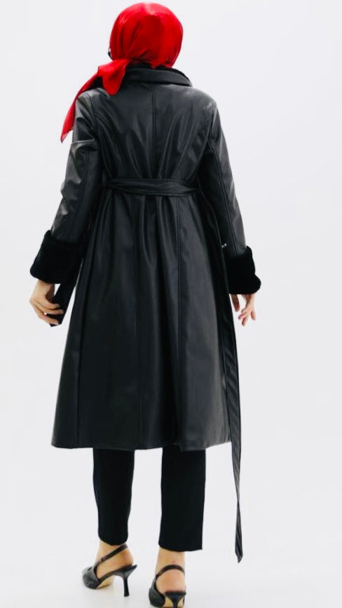 Kolu ve Yakası Kürklü Deri Kap Siyah