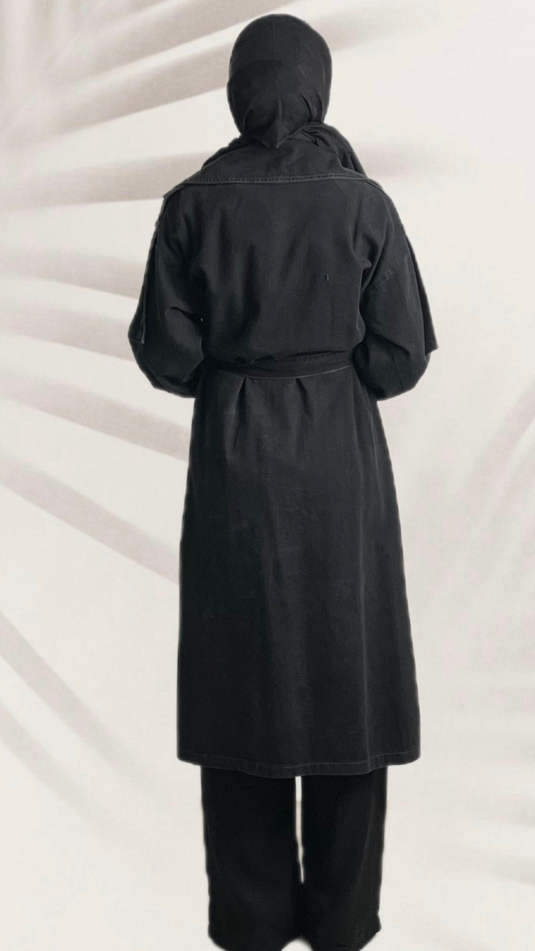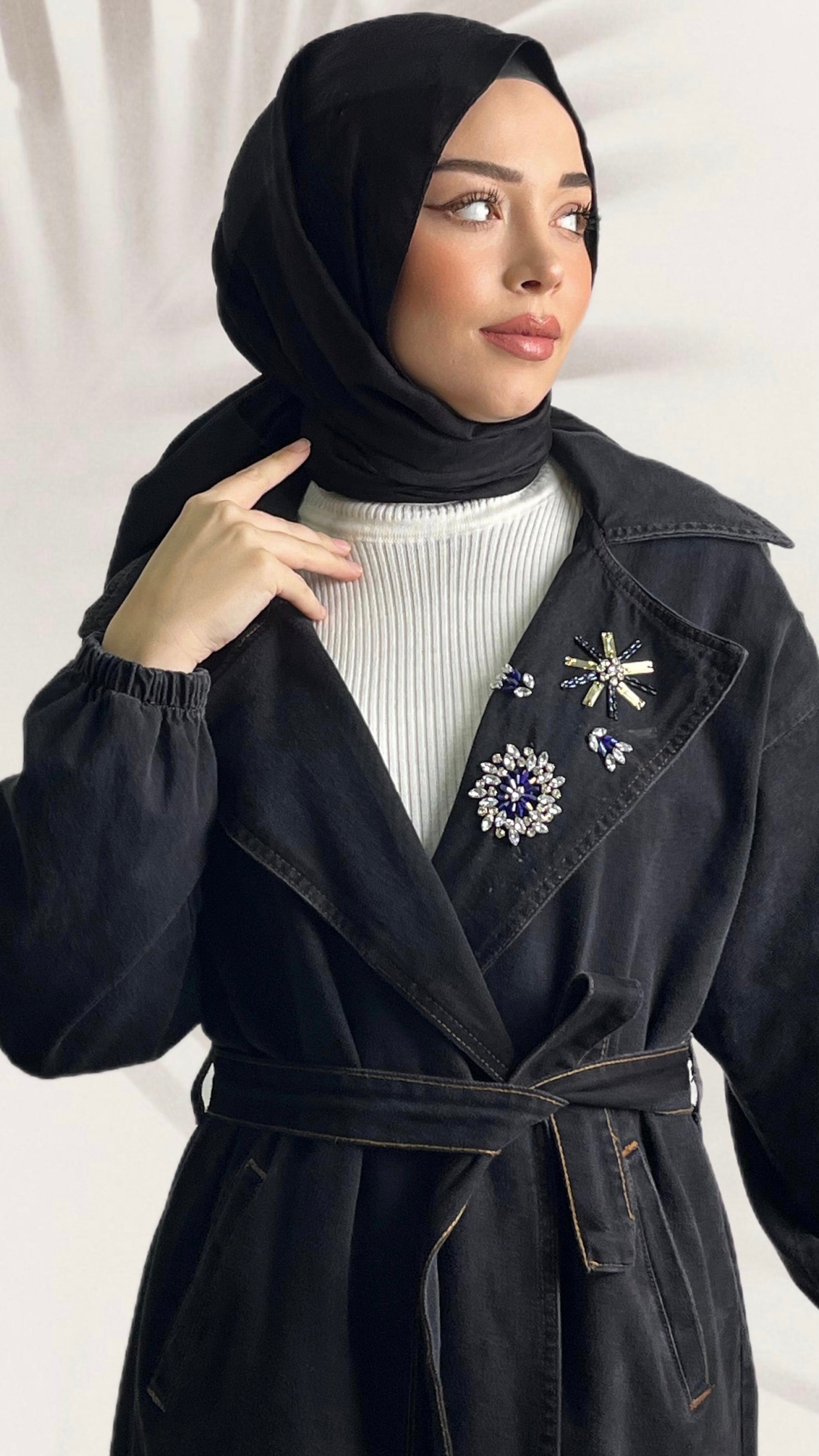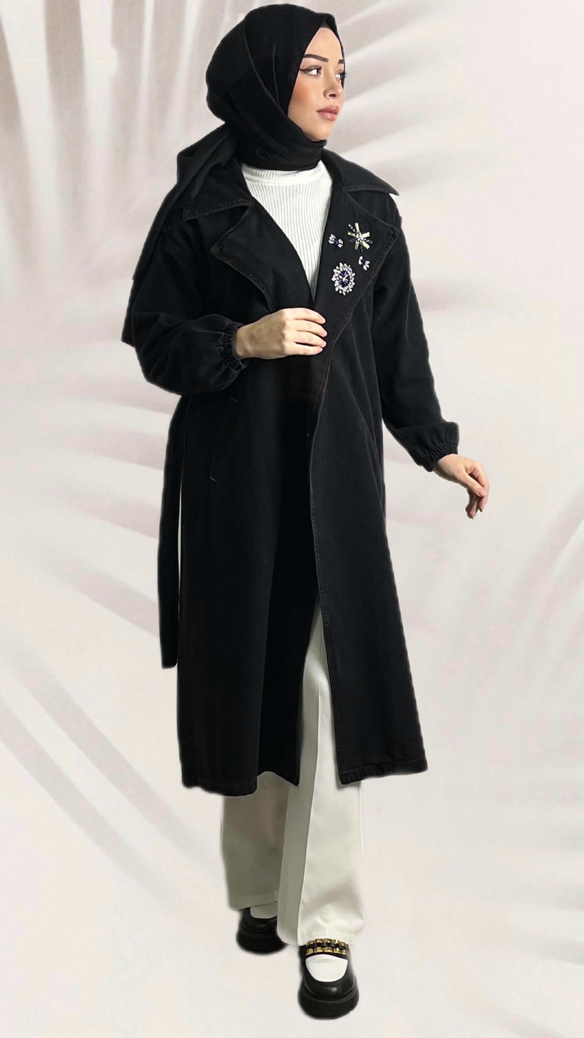 Apeletli Yaka Taşlı Kot Kap Siyah