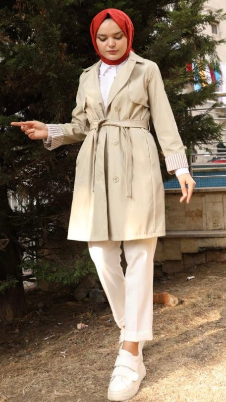 EDİTÖRÜN NOTU: Yeni sezon araboy trenç modelimizi mevsim geçişlerinde rahatlıkla kullanabilirsiniz. Kollarında çizgi detayları bulunmaktadır. Dilerseniz katlamadan da düz şekilde kullanabilirsiniz. Kuşak ürüne aittir.