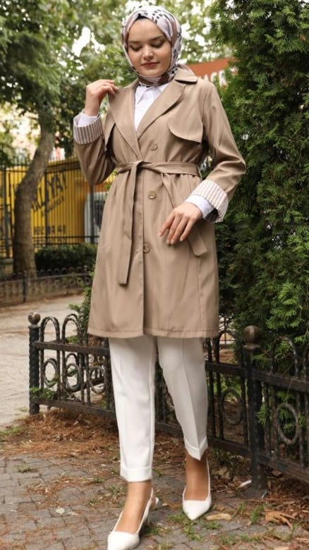 EDİTÖRÜN NOTU: Yeni sezon araboy trenç modelimizi mevsim geçişlerinde rahatlıkla kullanabilirsiniz. Kollarında çizgi detayları bulunmaktadır. Dilerseniz katlamadan da düz şekilde kullanabilirsiniz. Kuşak ürüne aittir.