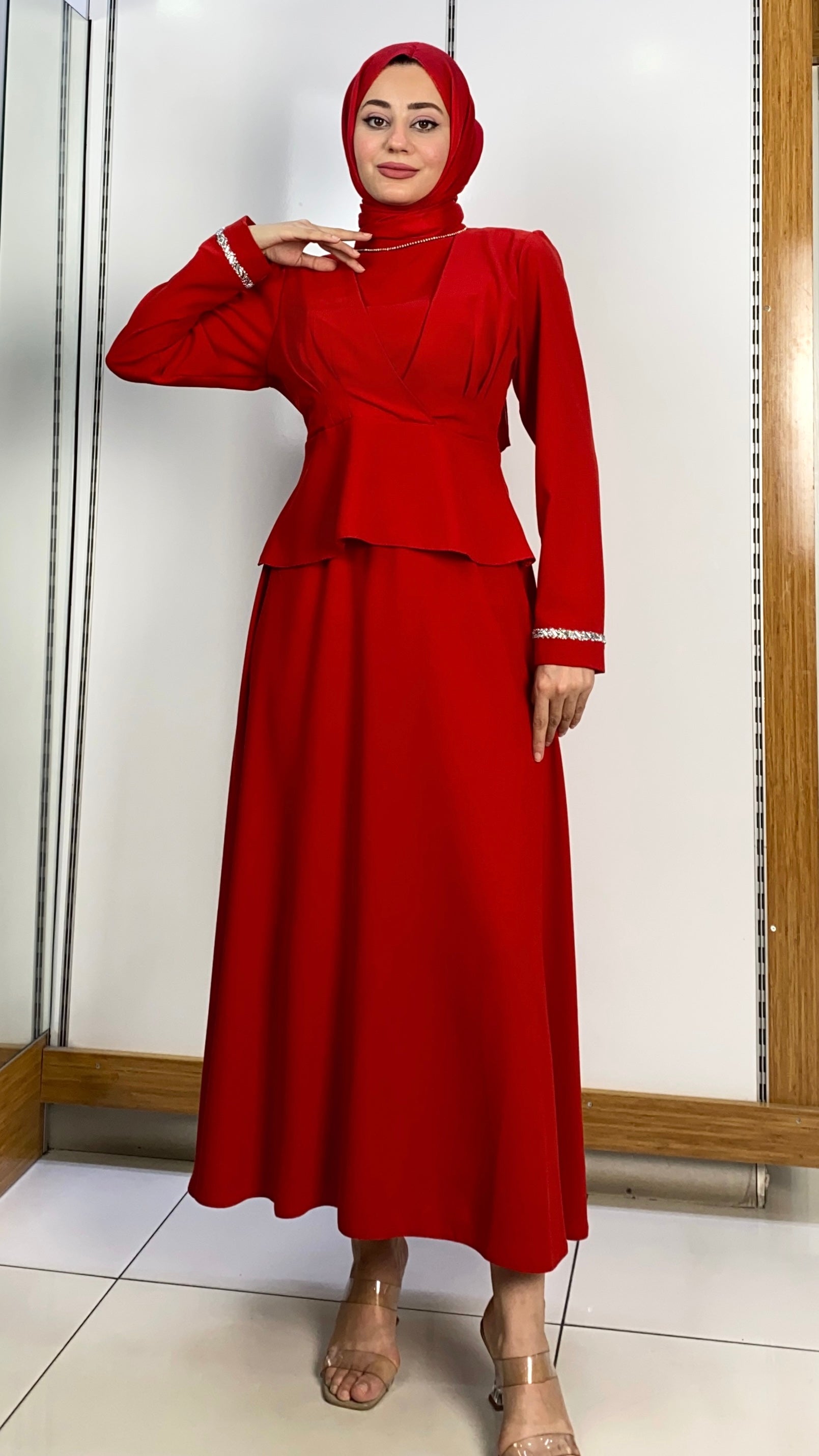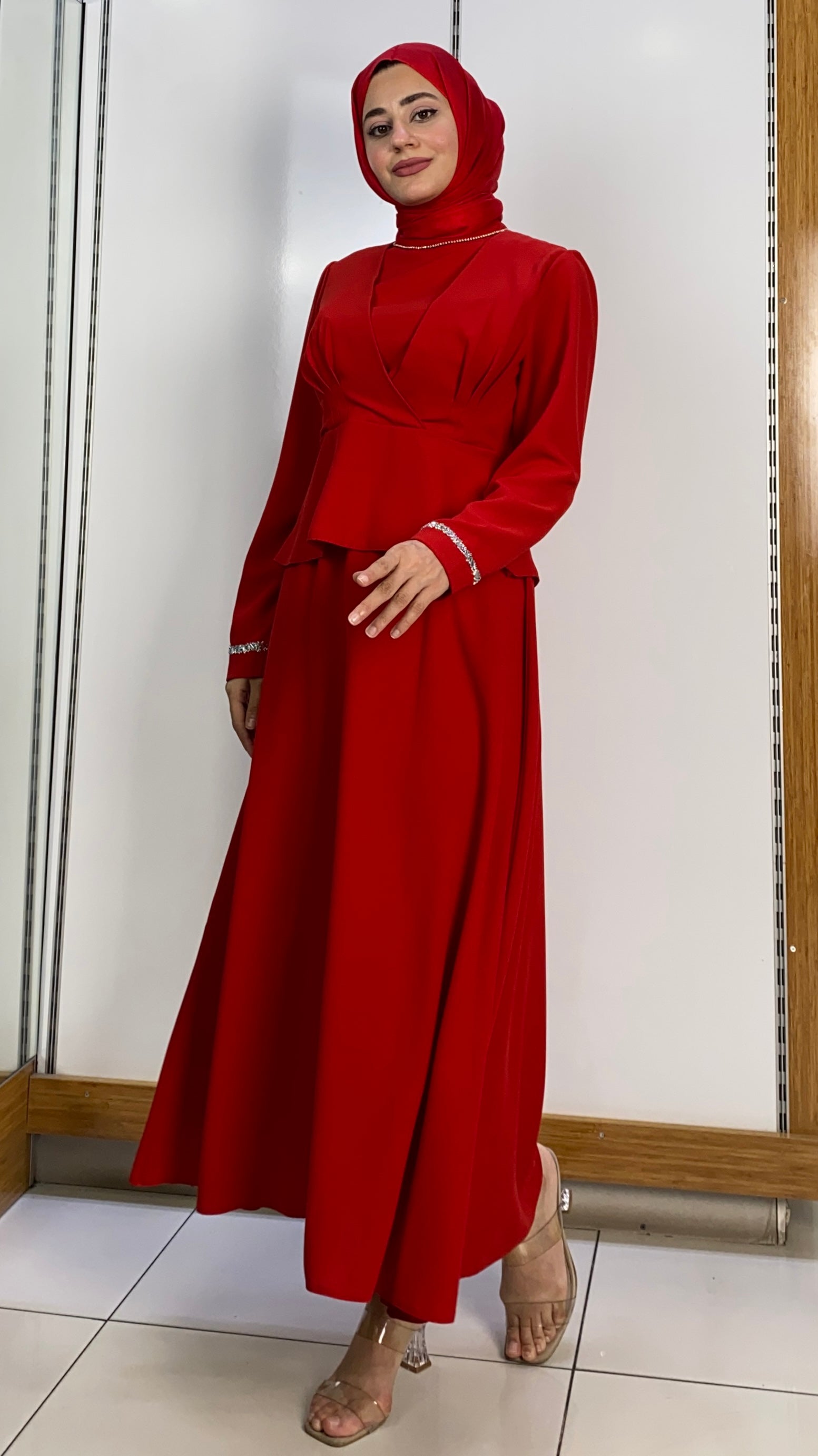 Boğazı İncili Etekli Takım Kırmızı