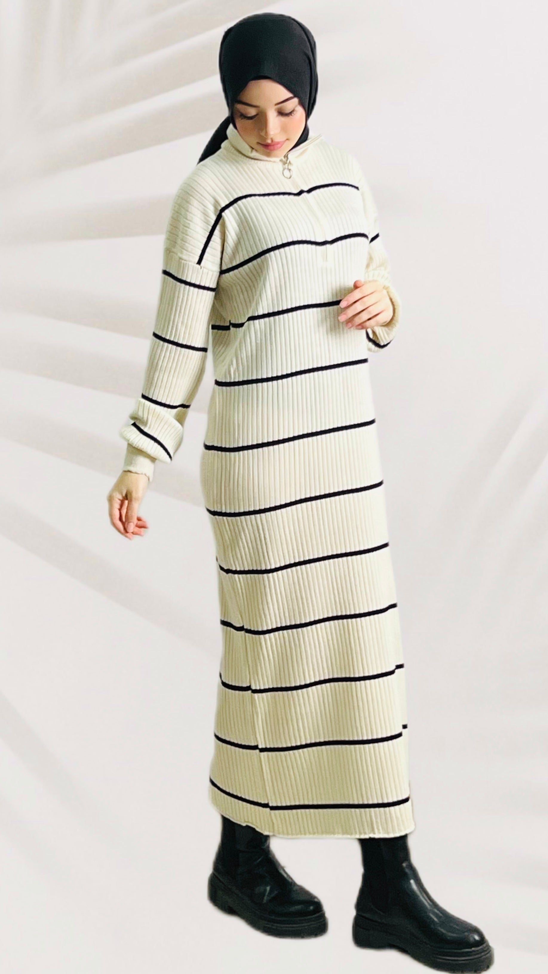 ÜRÜN ADI: Çizgi Desenli Yarım Boğaz Fermuarlı Triko Elbise