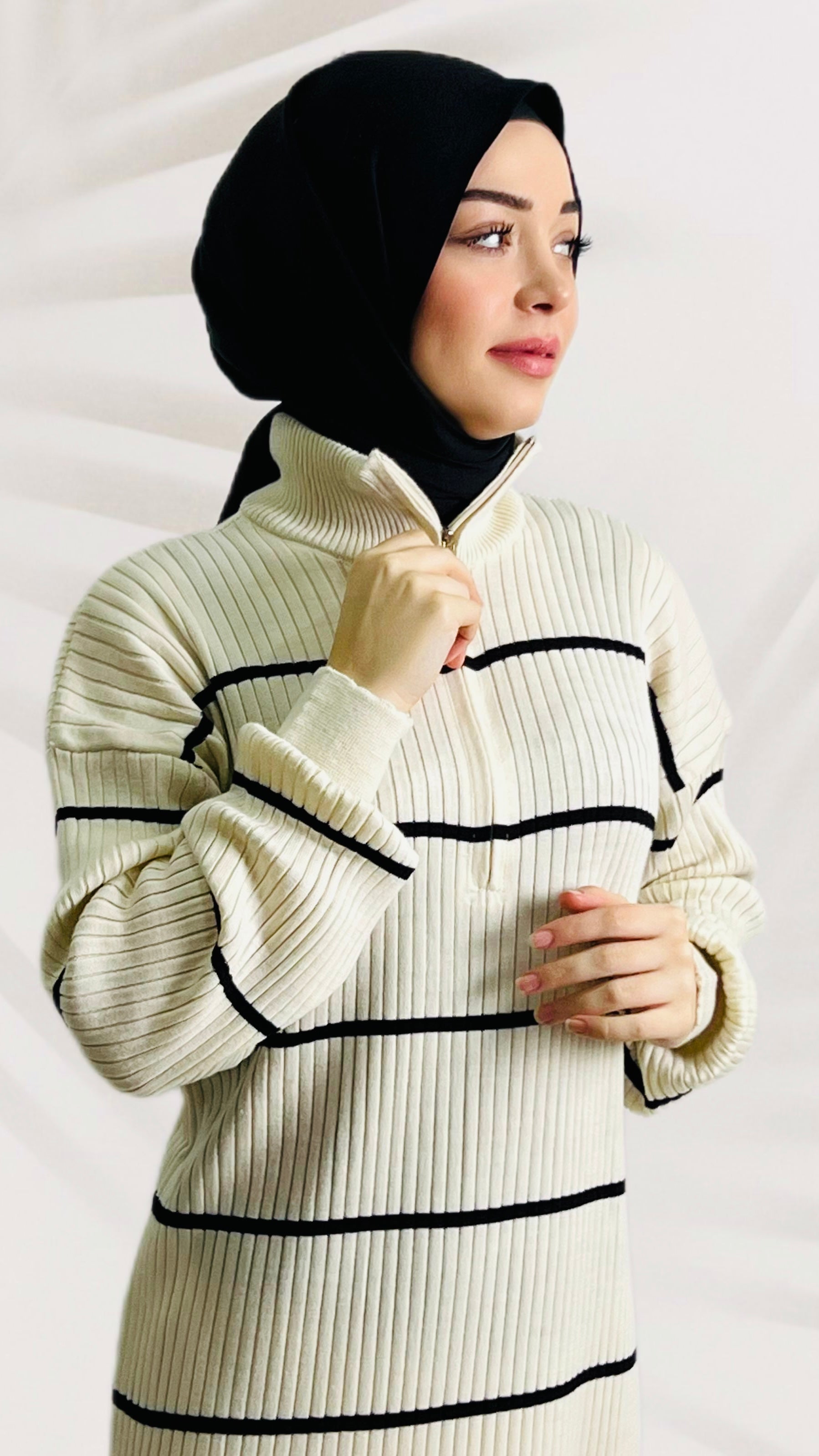 Çizgi Desenli Yarım Boğaz Fermuarlı Triko Elbise Bej