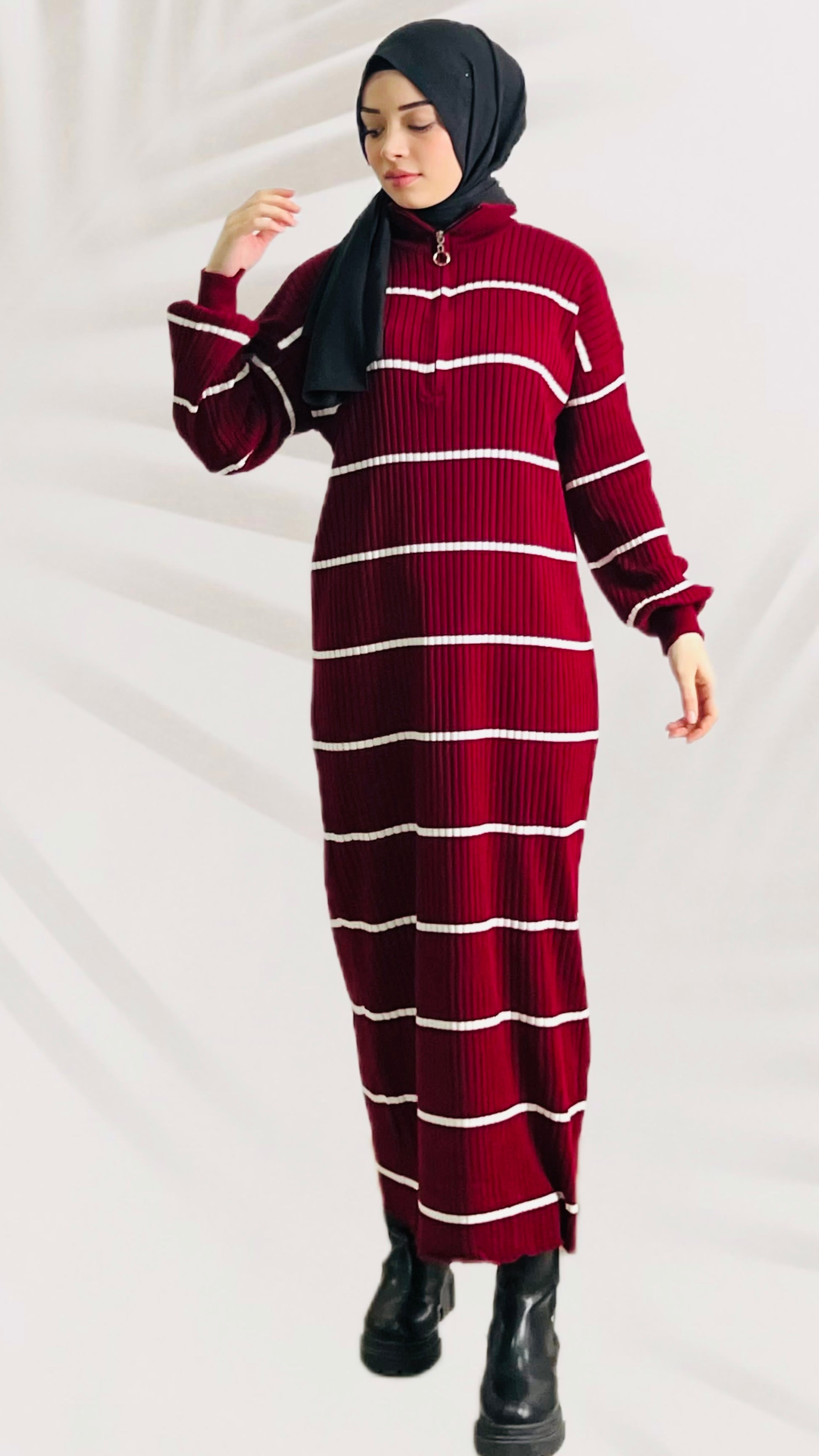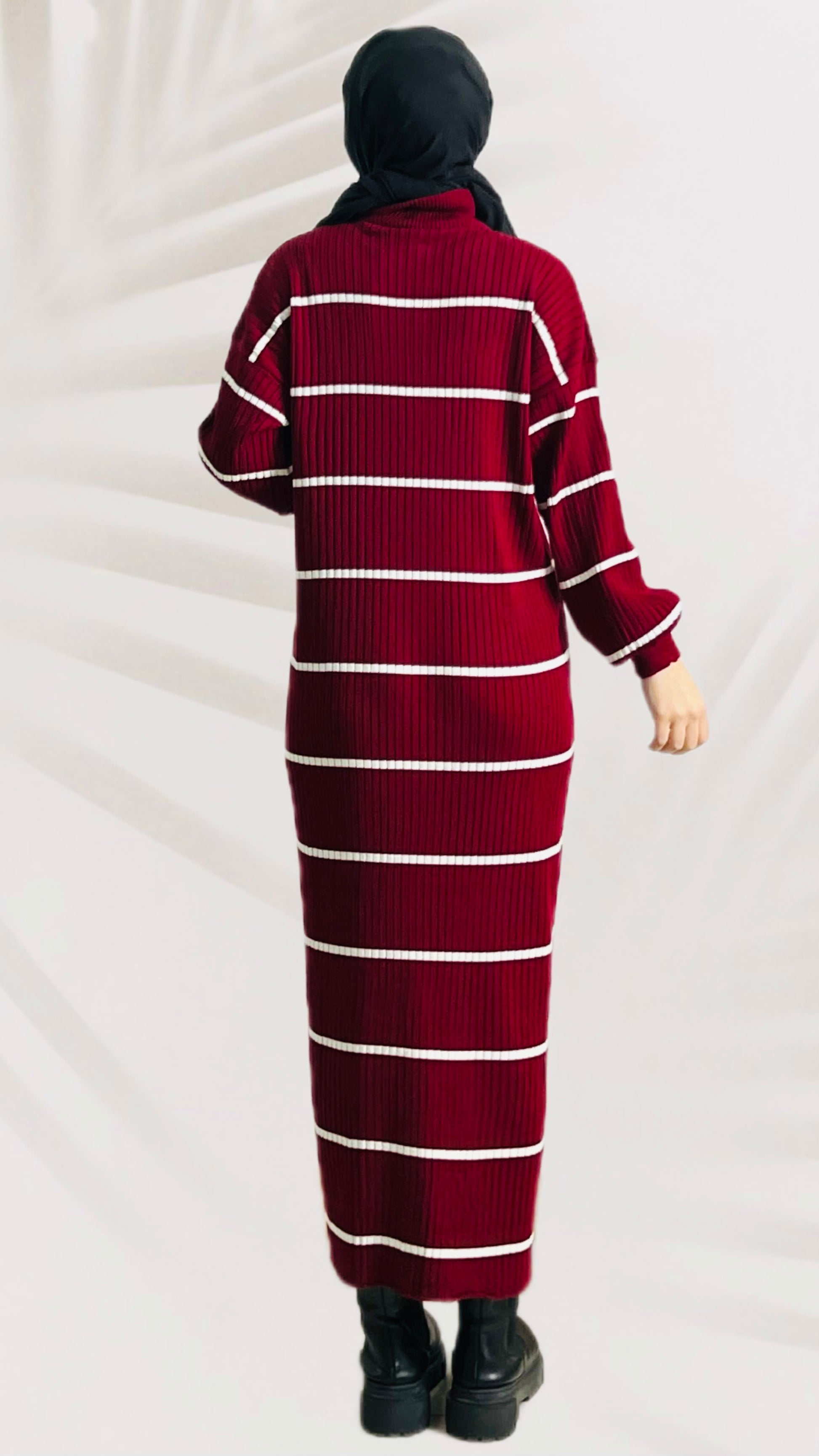 Çizgi Desenli Yarım Boğaz Fermuarlı Triko Elbise Bordo