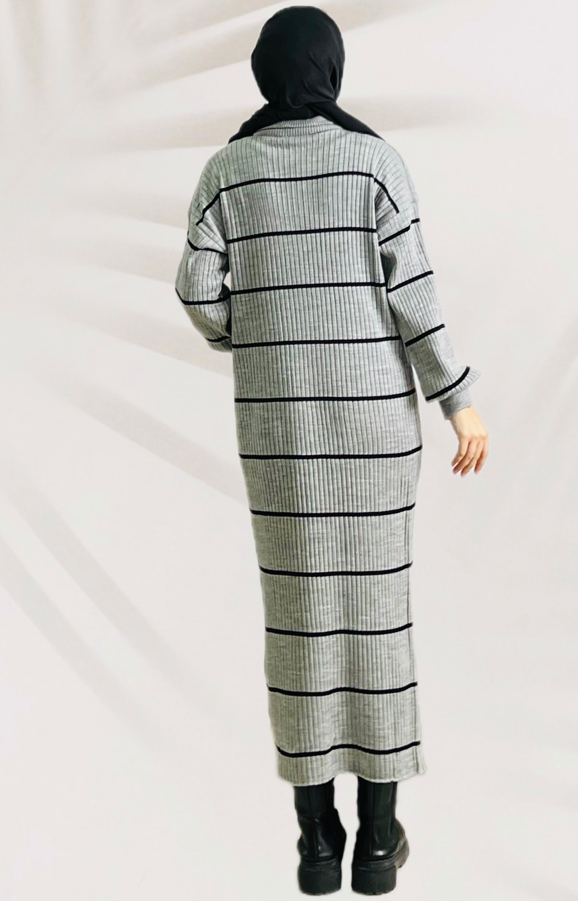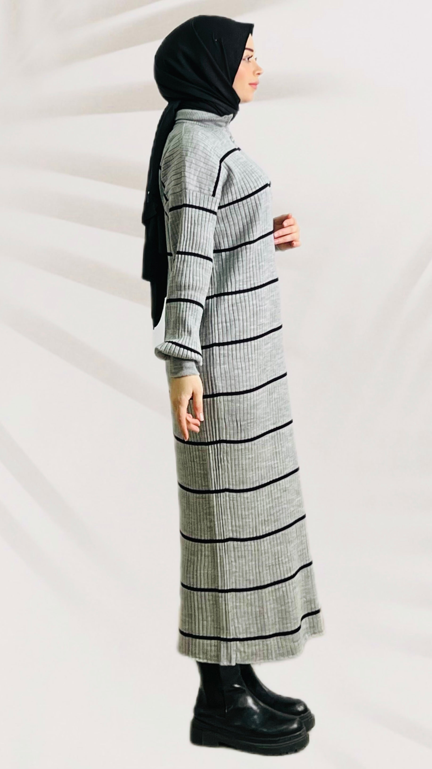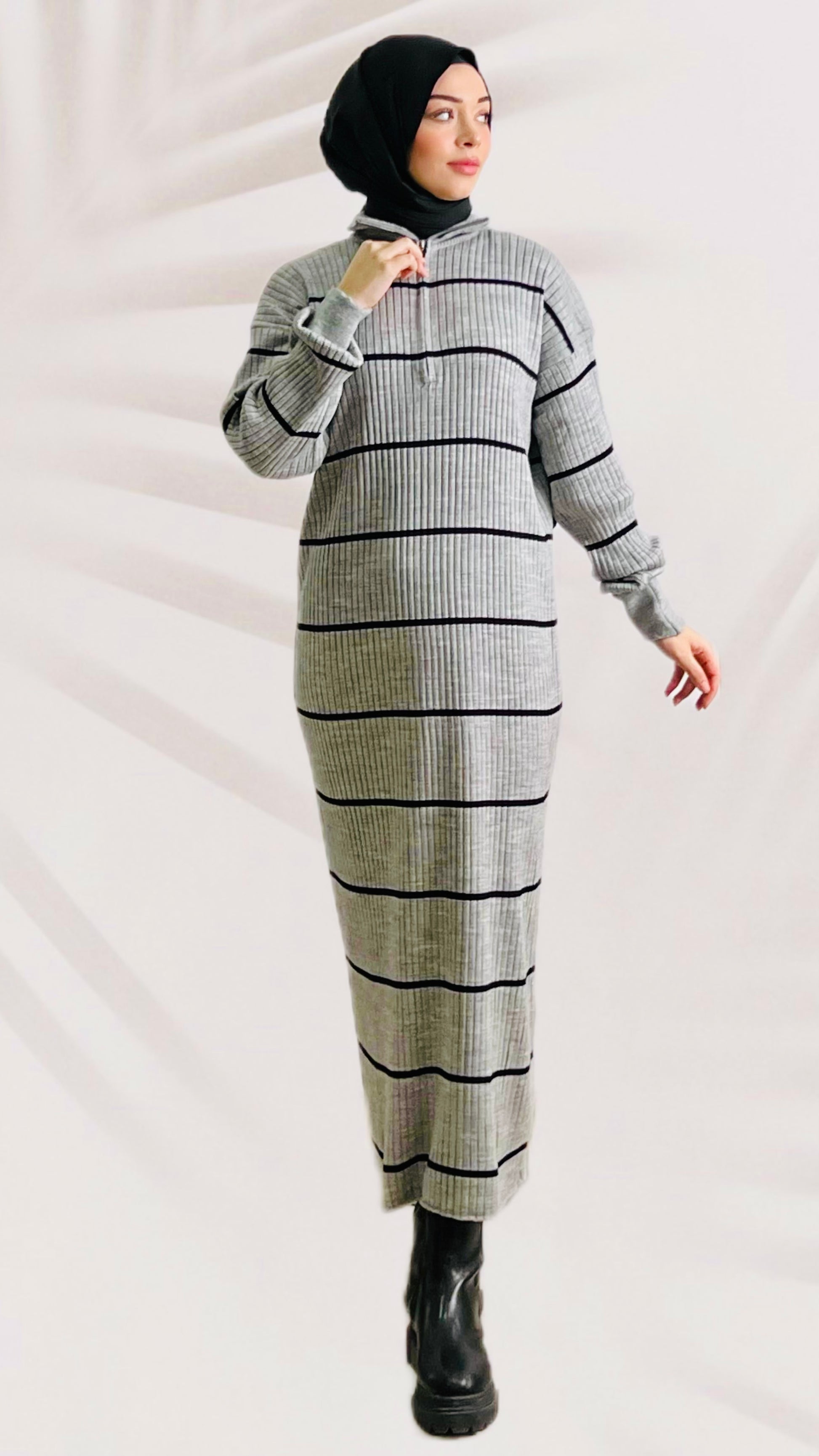 Çizgi Desenli Yarım Boğaz Fermuarlı Triko Elbise Gri