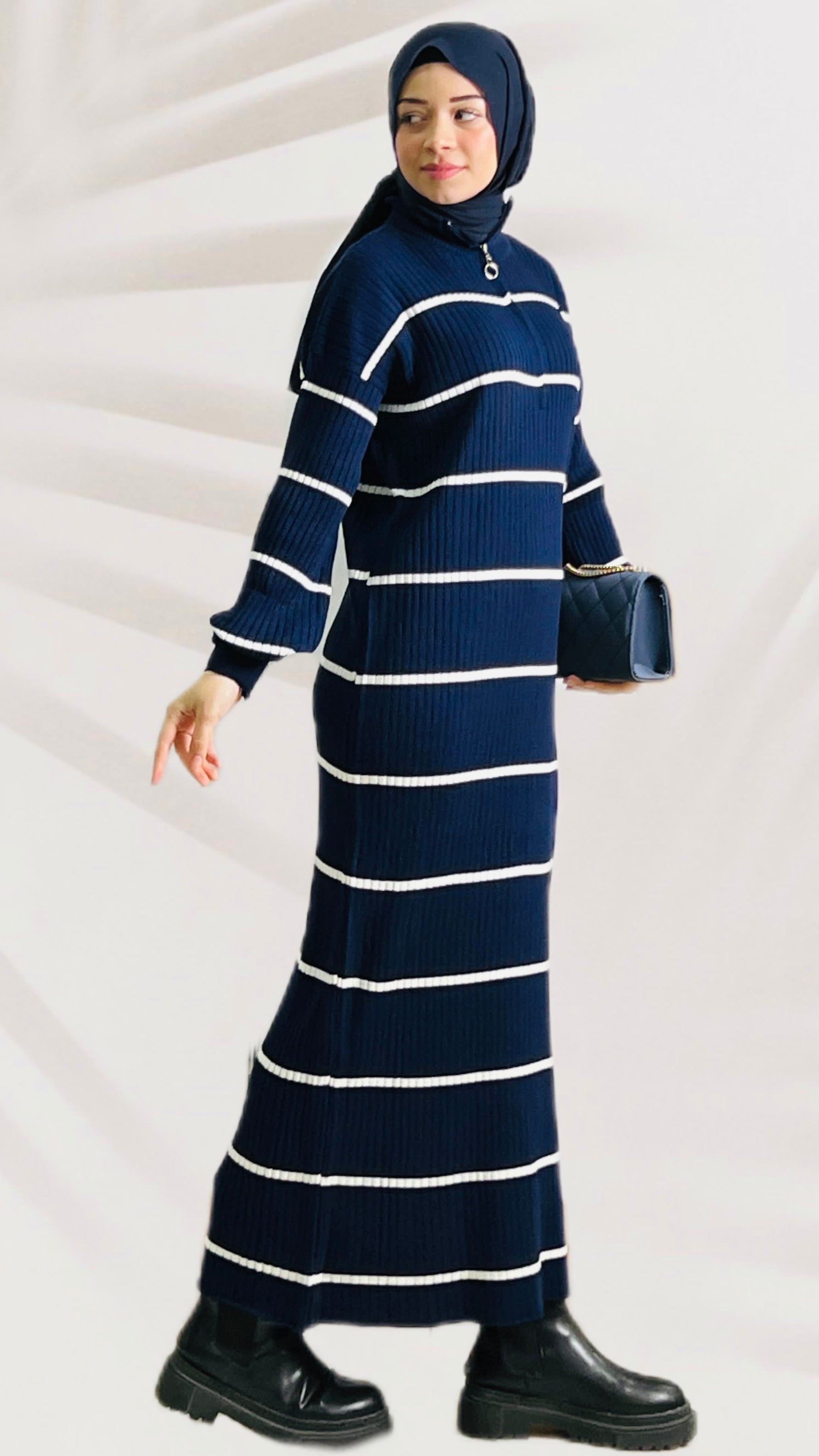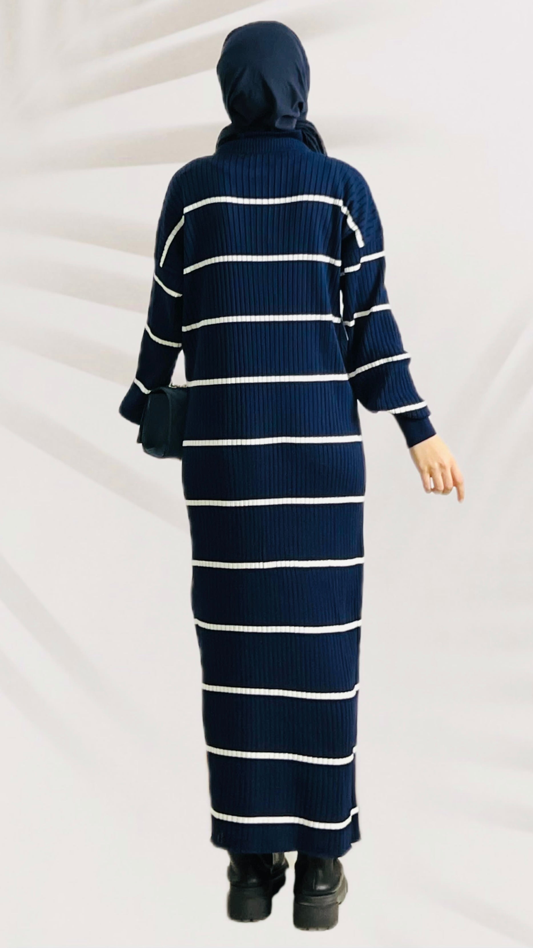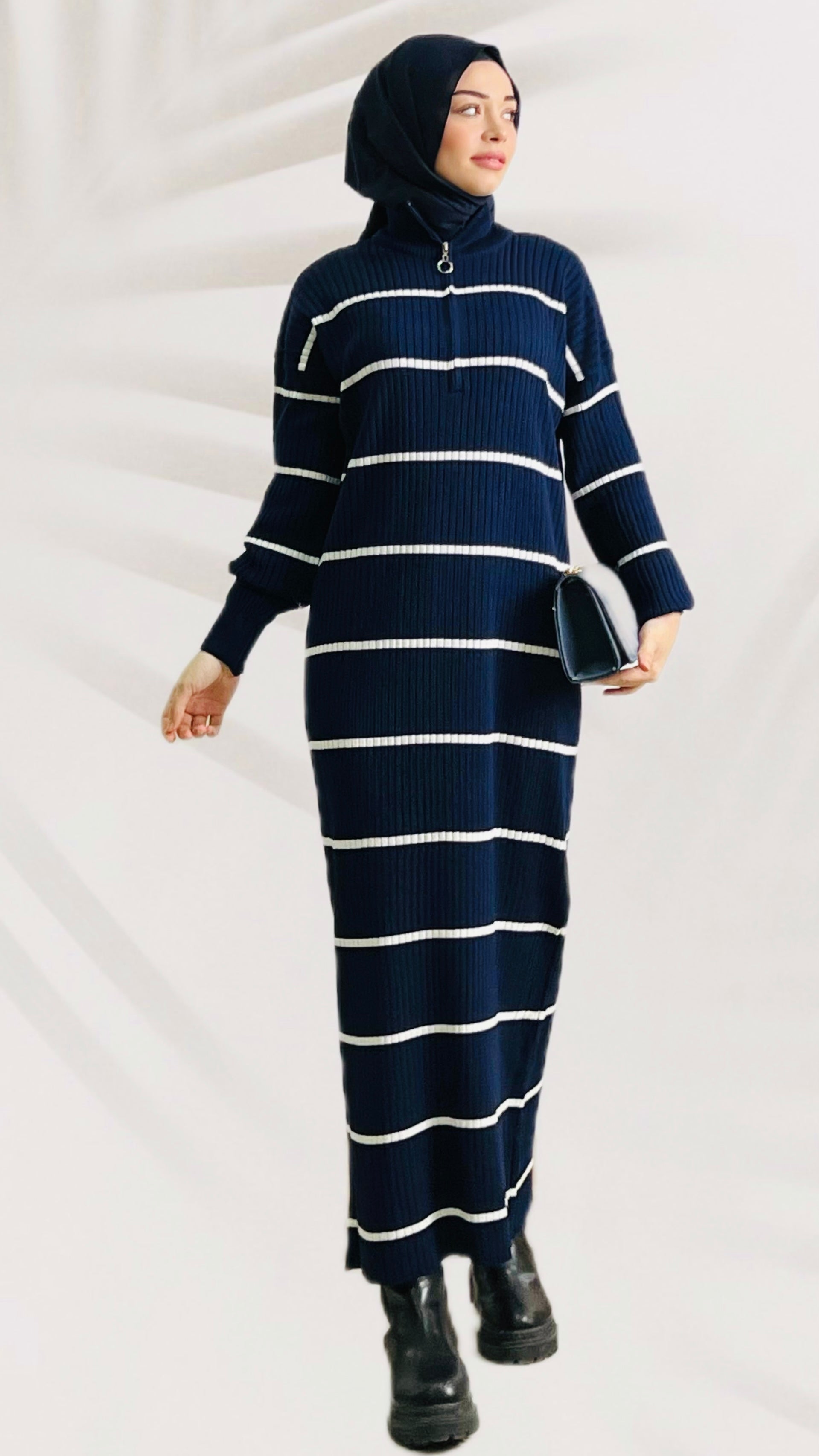 ÜRÜN ADI: Çizgi Desenli Yarım Boğaz Fermuarlı Triko Elbise