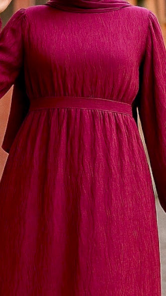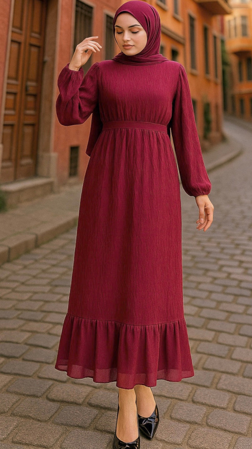 Eteği Fırfırlı Kuşaklı Astarlı Şifon Elbise Bordo