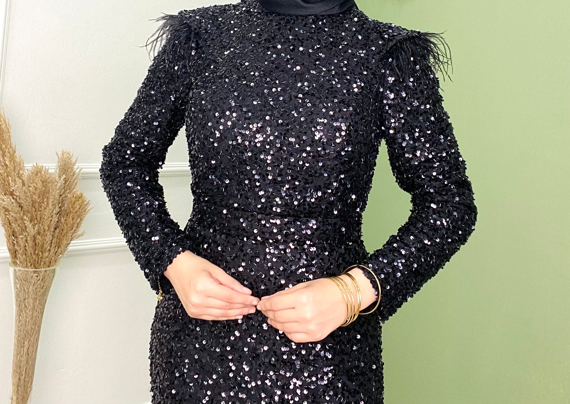 Omzu Tüy Detaylı Payetli Abiye Siyah