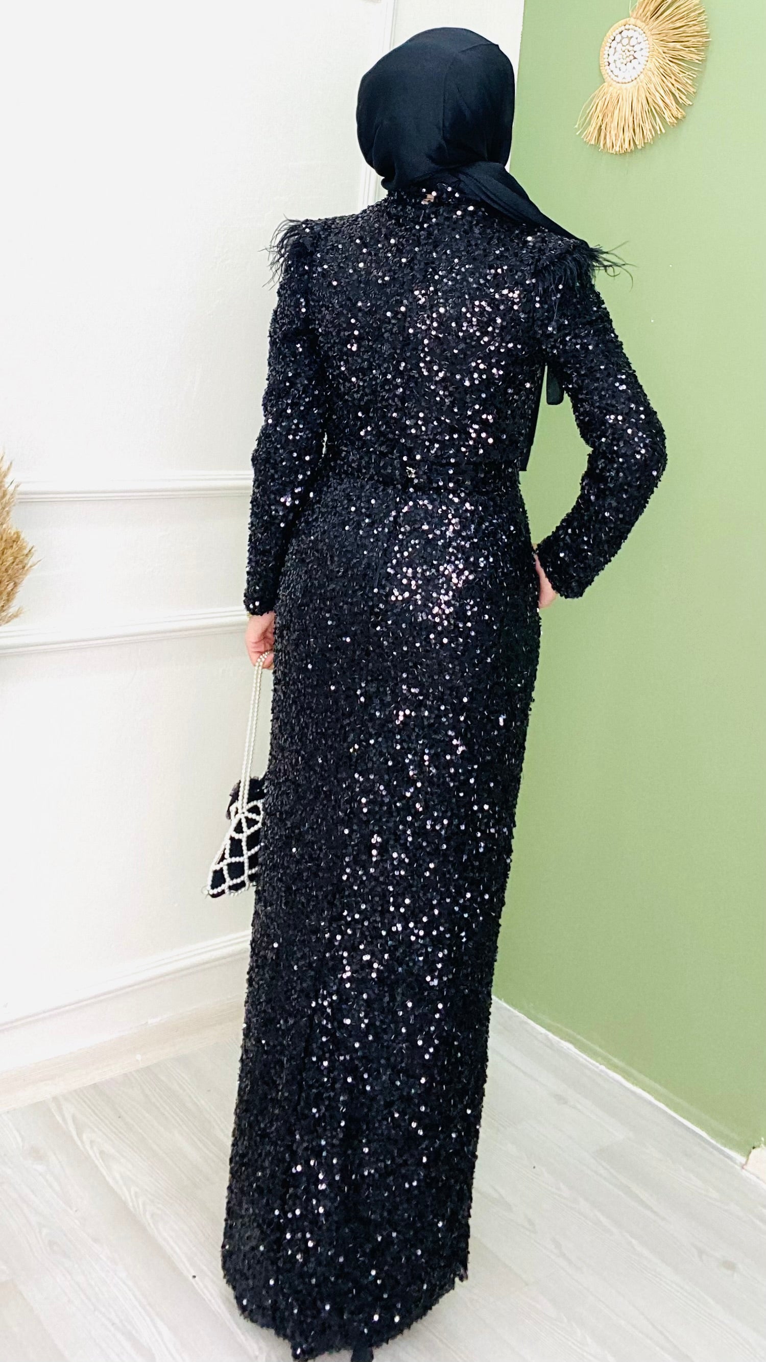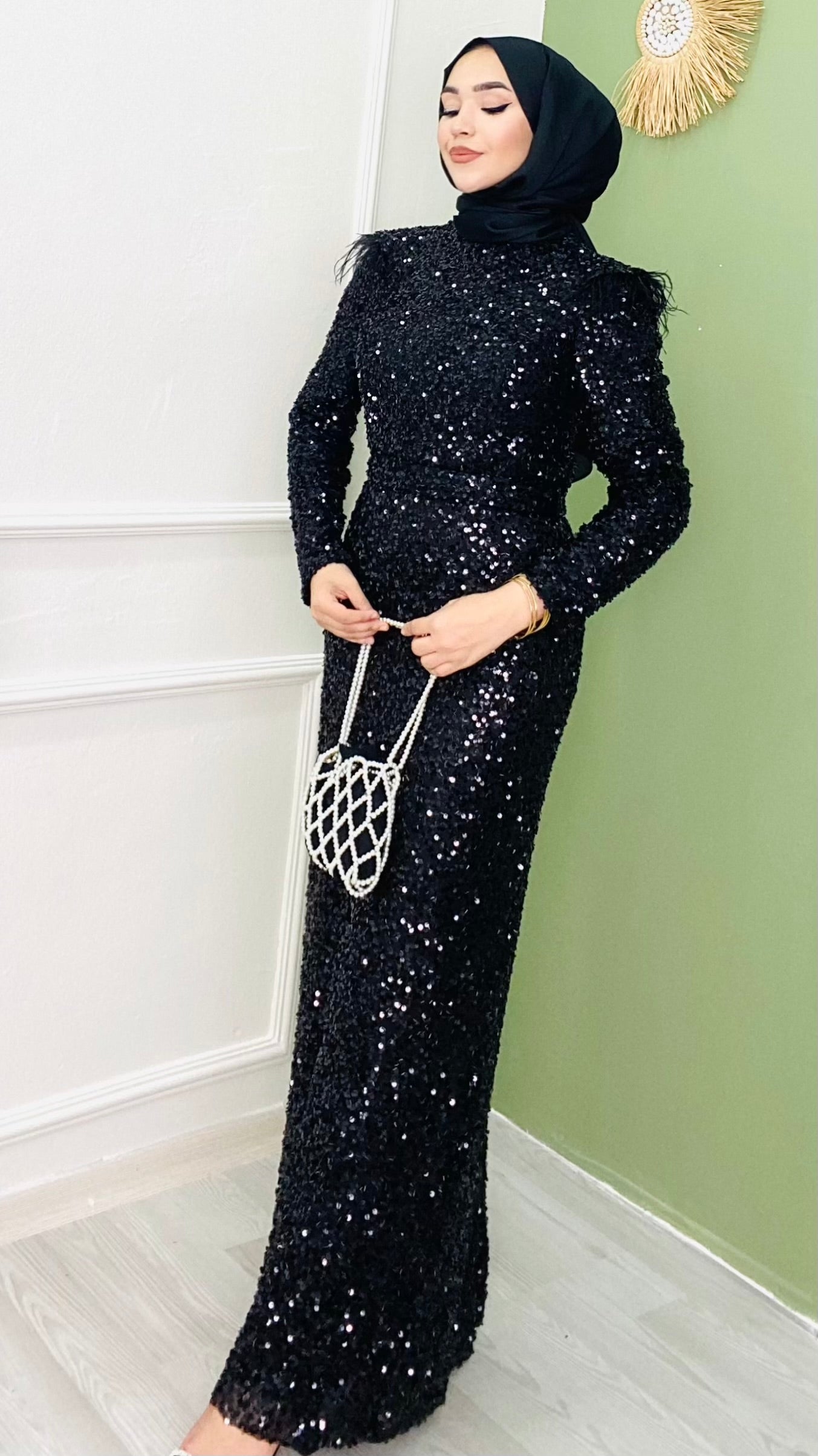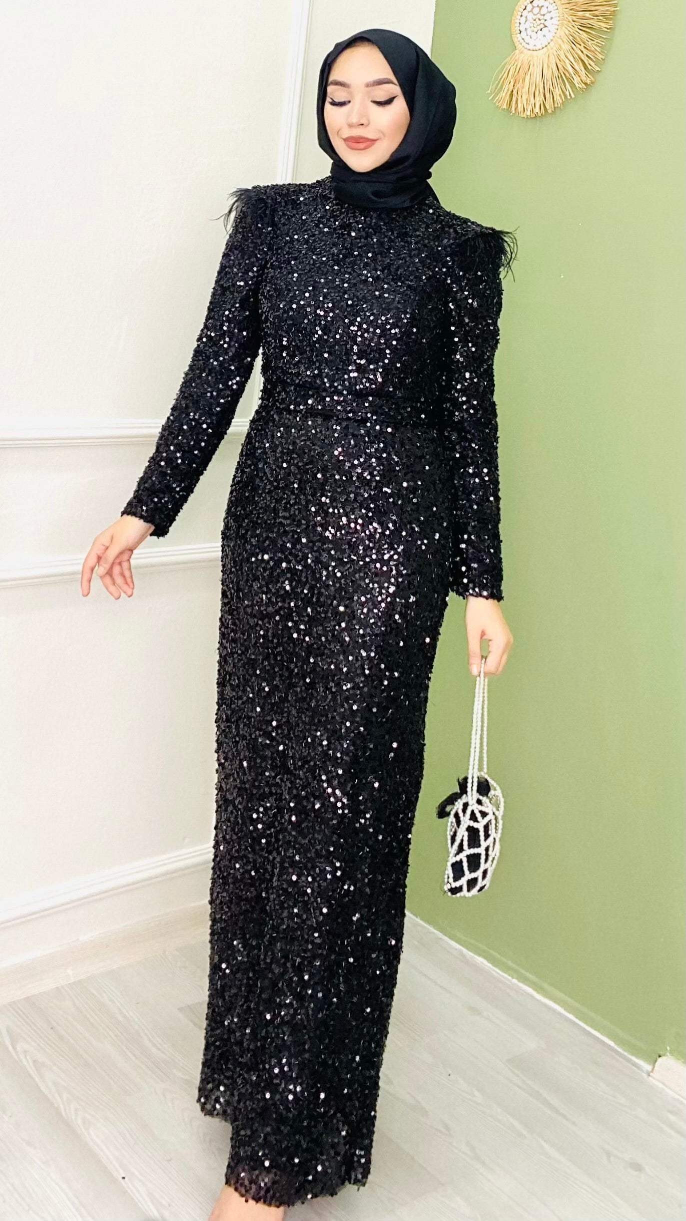 EDİTÖRÜN NOTU: Yeni sezon full payetli kalem model olan abiye modelimizi özel günlerde abartı seven müşterilerimiz için önerimizdir. Omuzlarında tüy detayı bulunmaktaıdr. Seyyar kuşağı vardır. Zarif bir üründür.