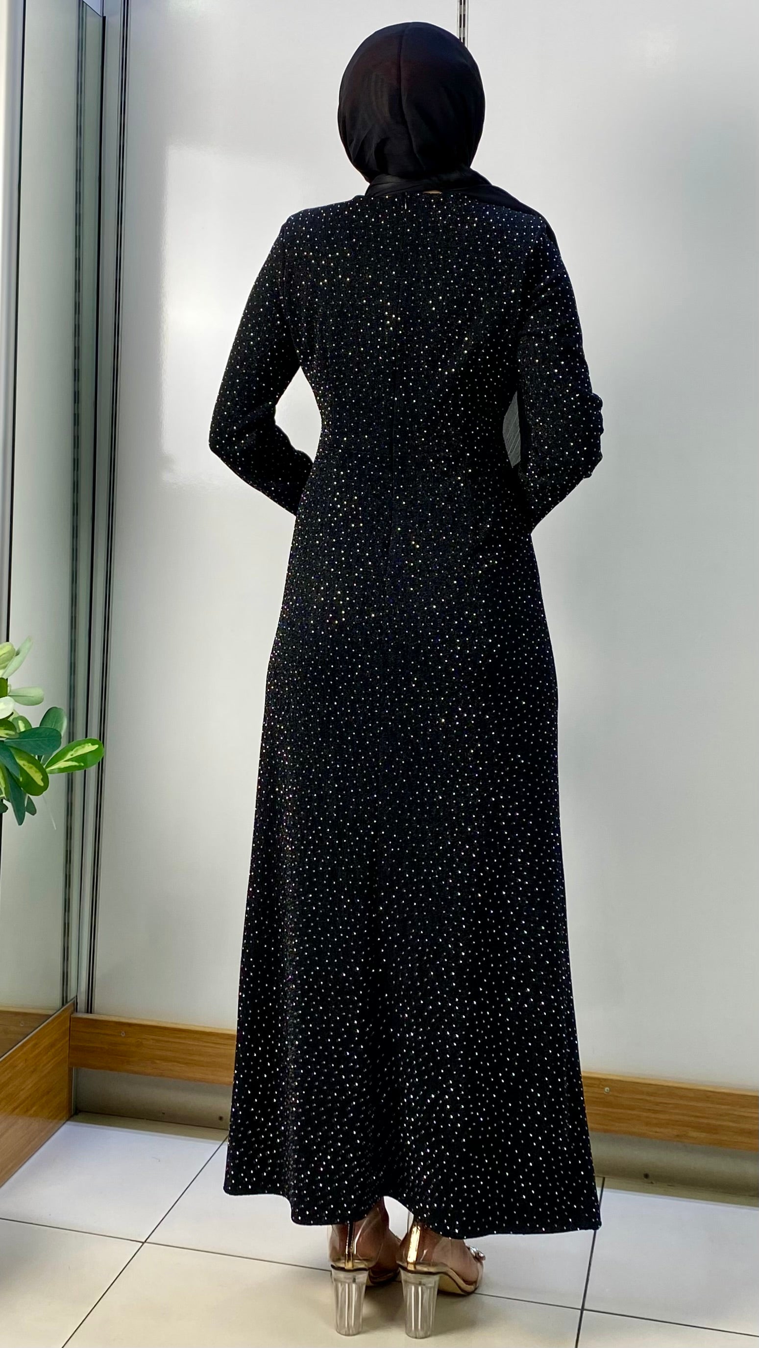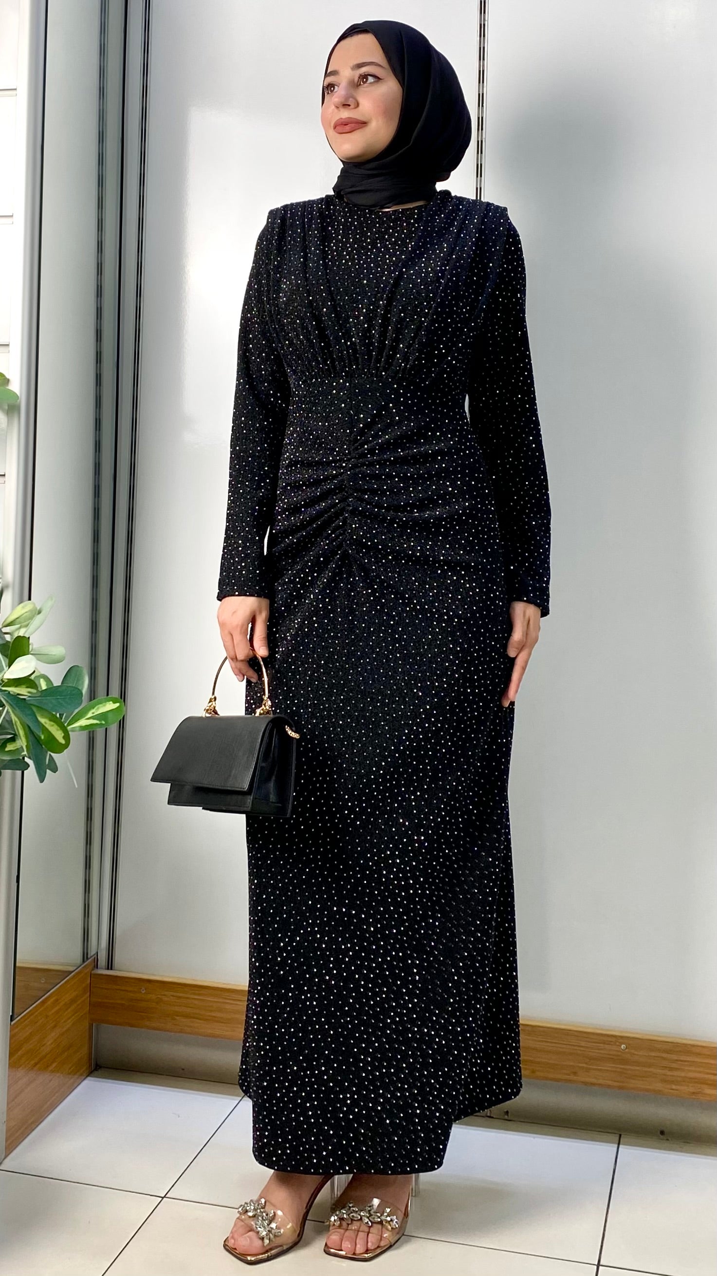 Önden Büzgü Detaylı Simli Abiye Siyah