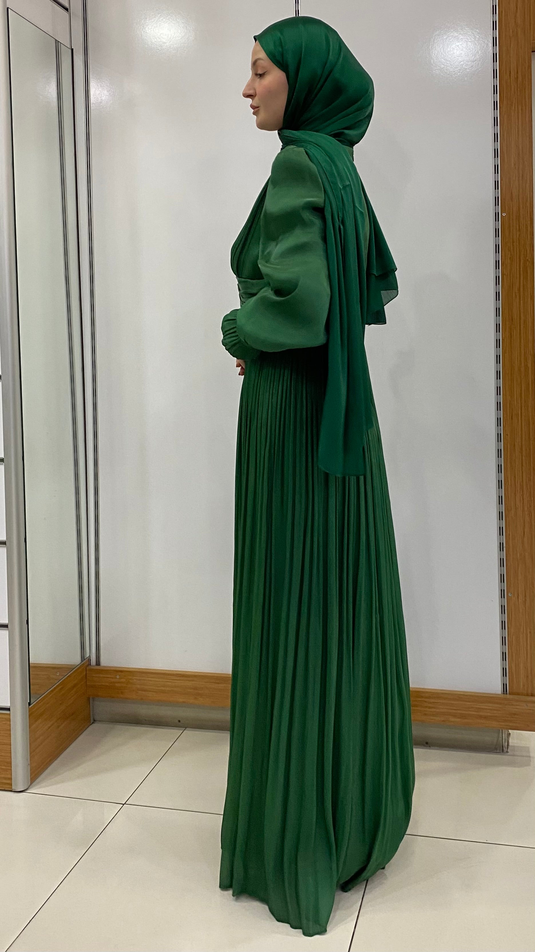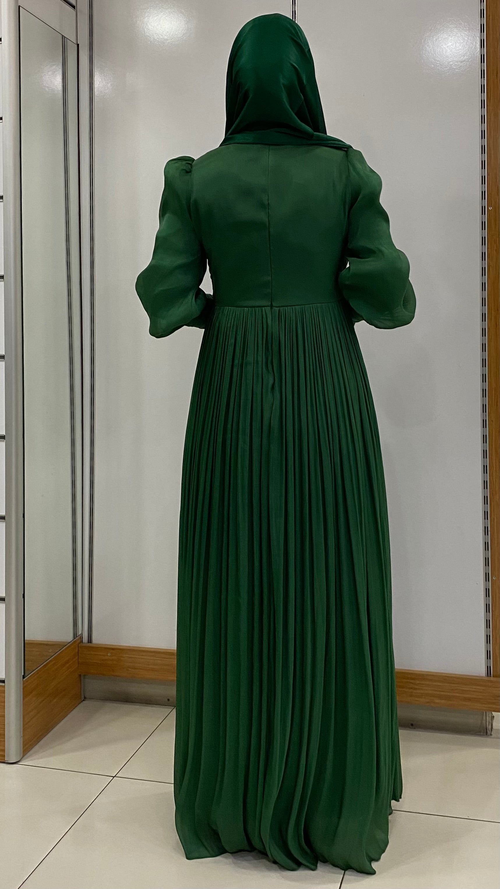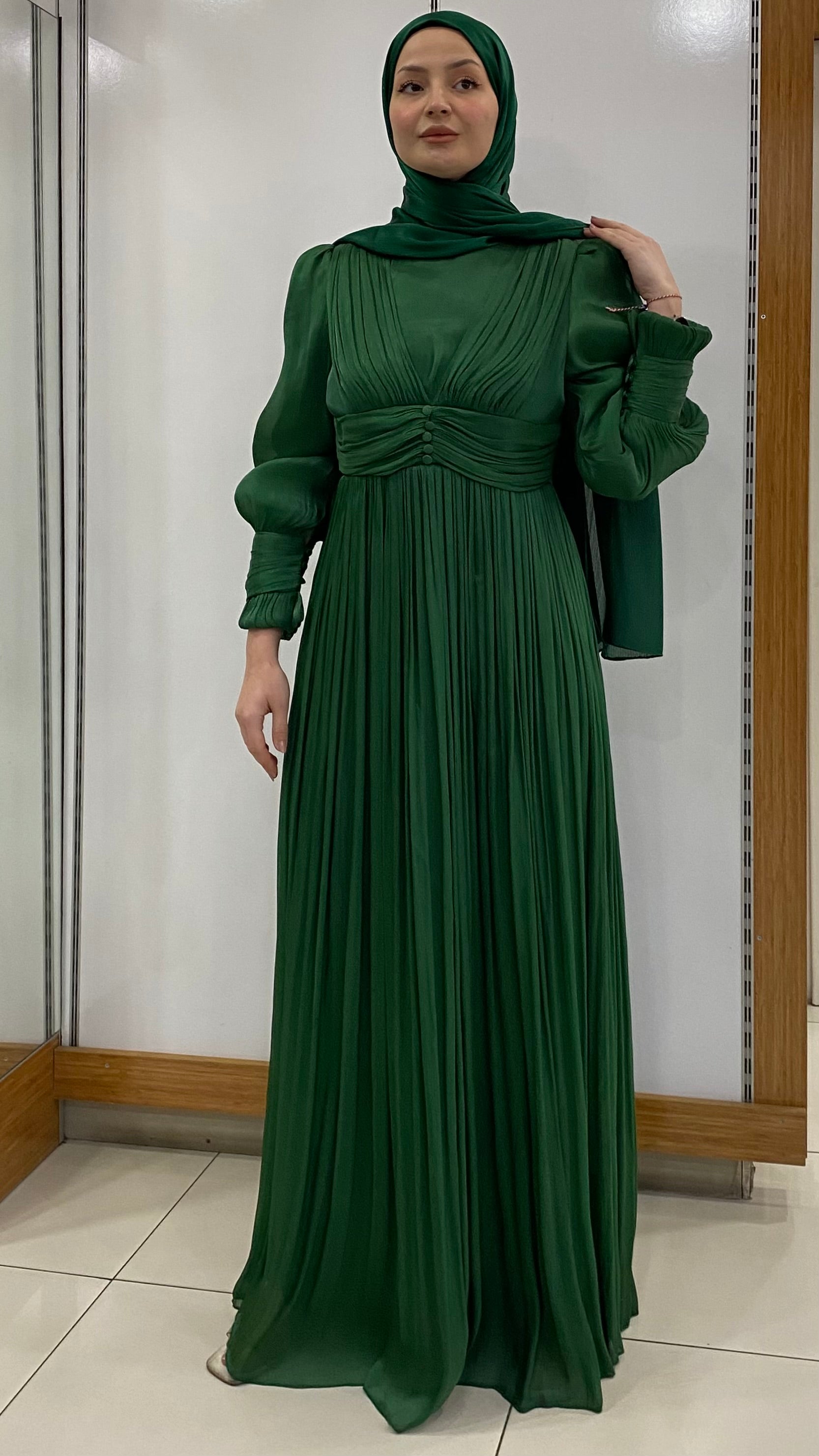 Önü Düğme Detaylı Kolu Manşetli Abiye Zümrüt Yeşili