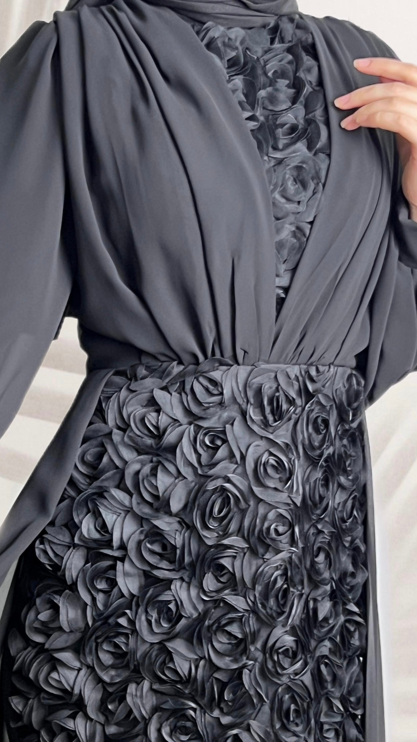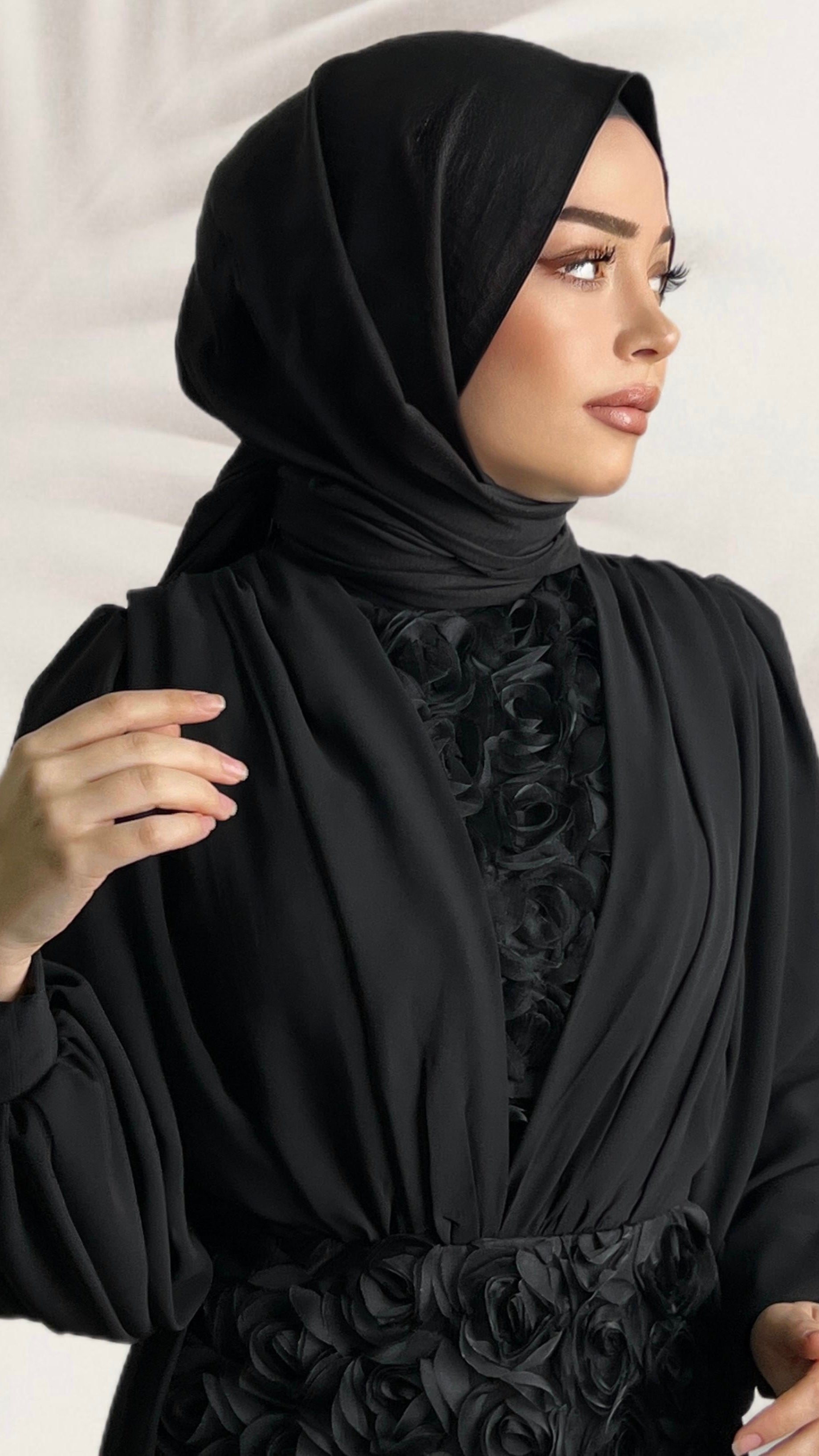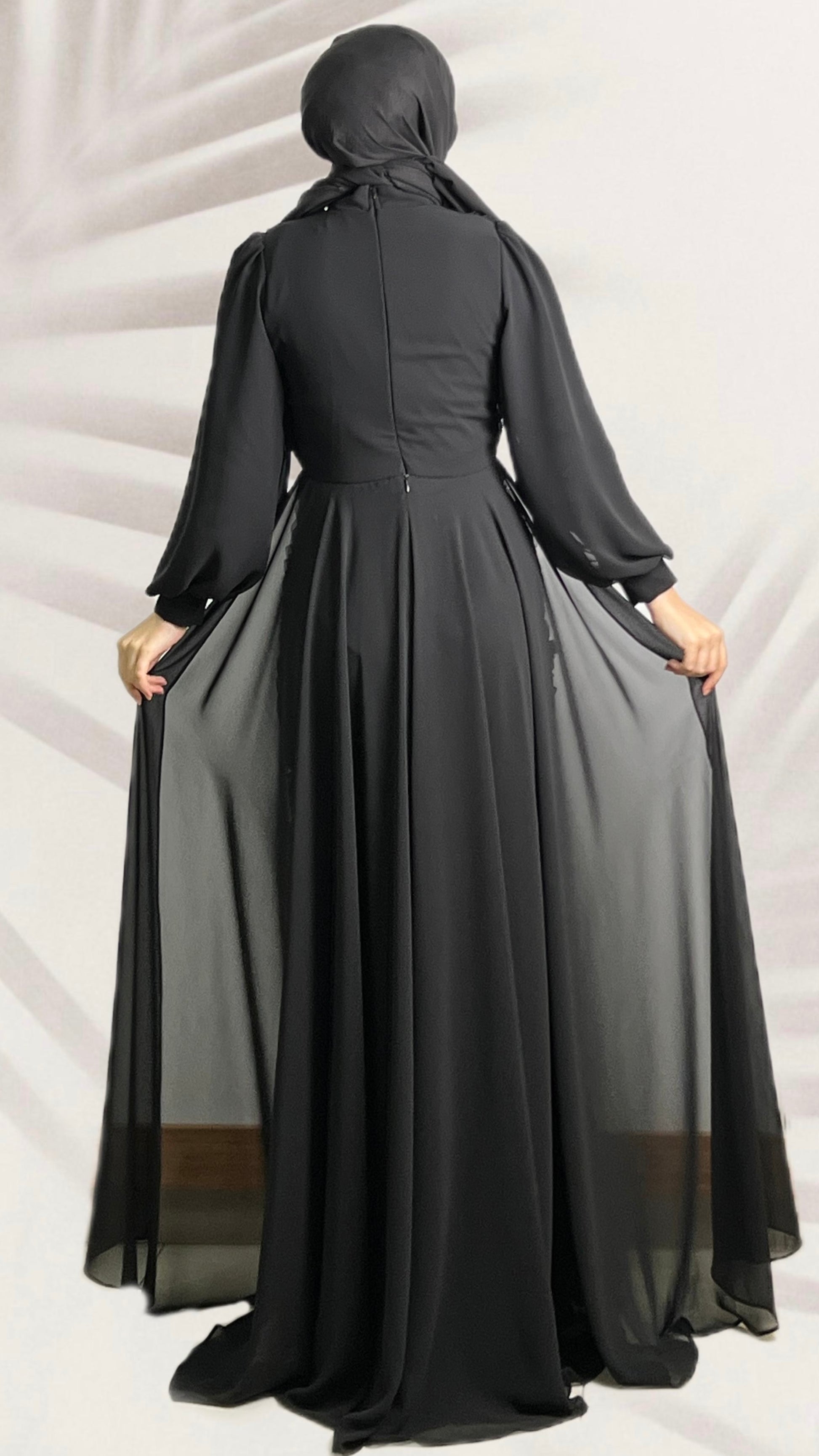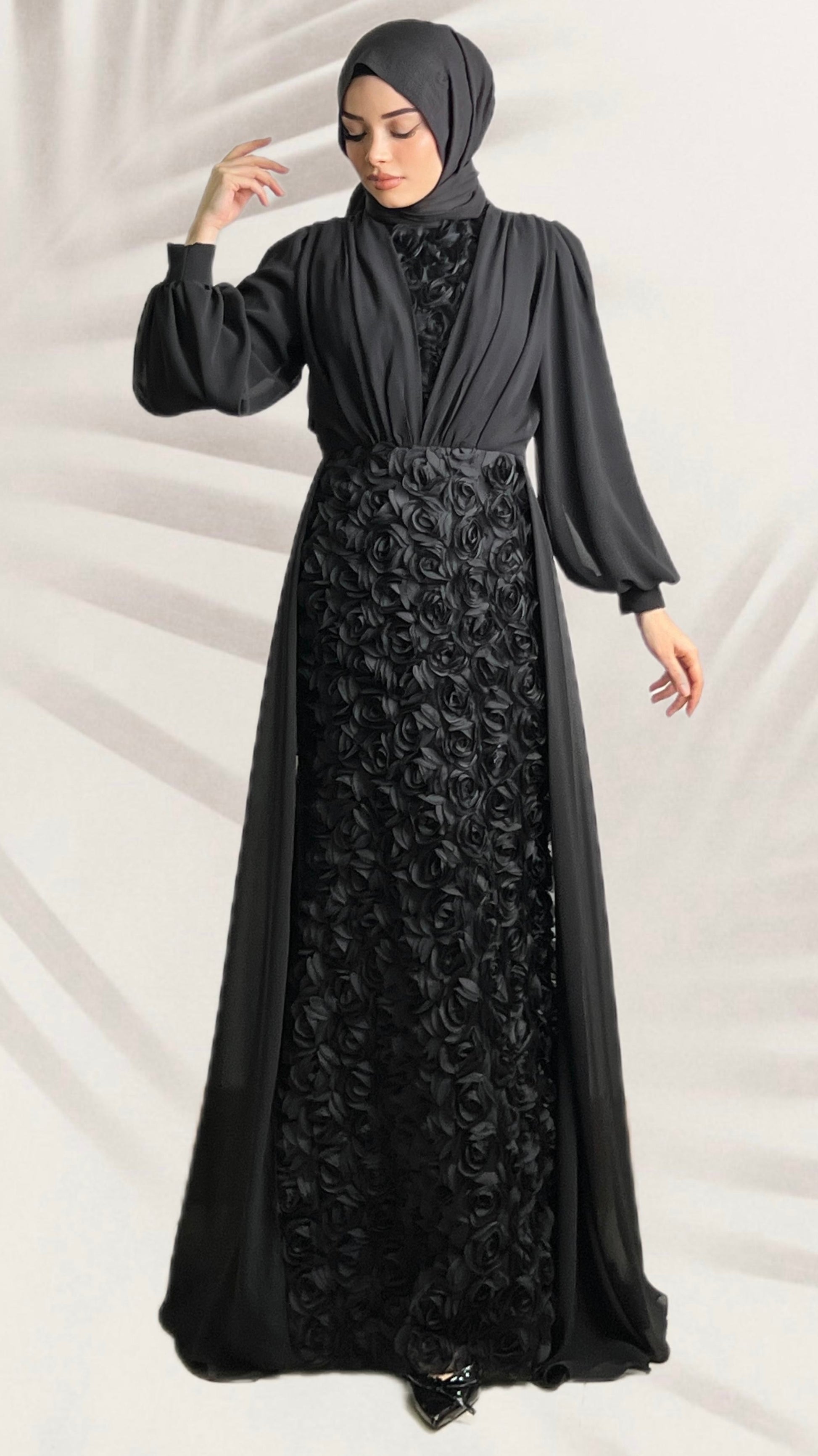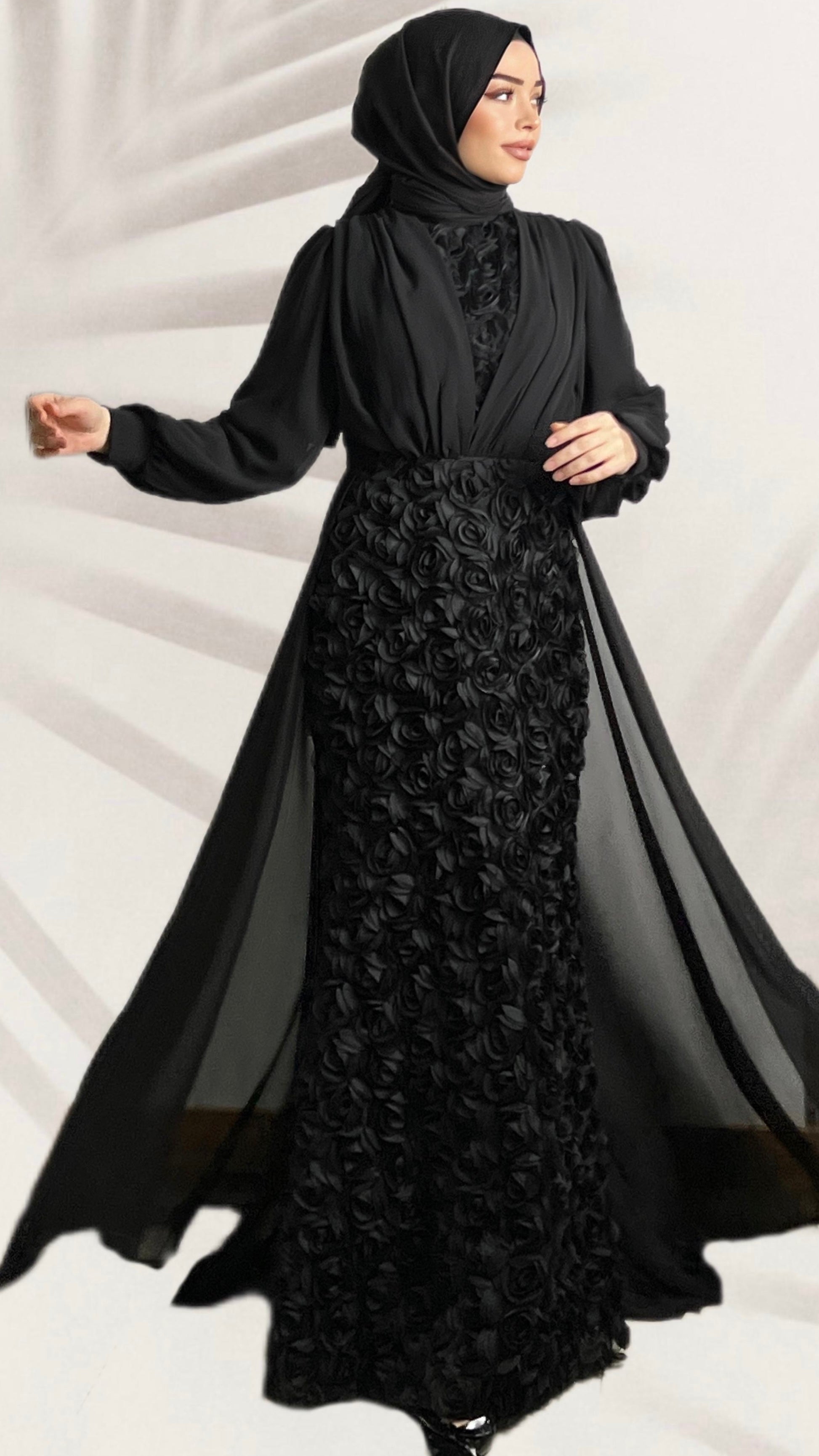 Önü Gül Detaylı Pelerinli Abiye Siyah