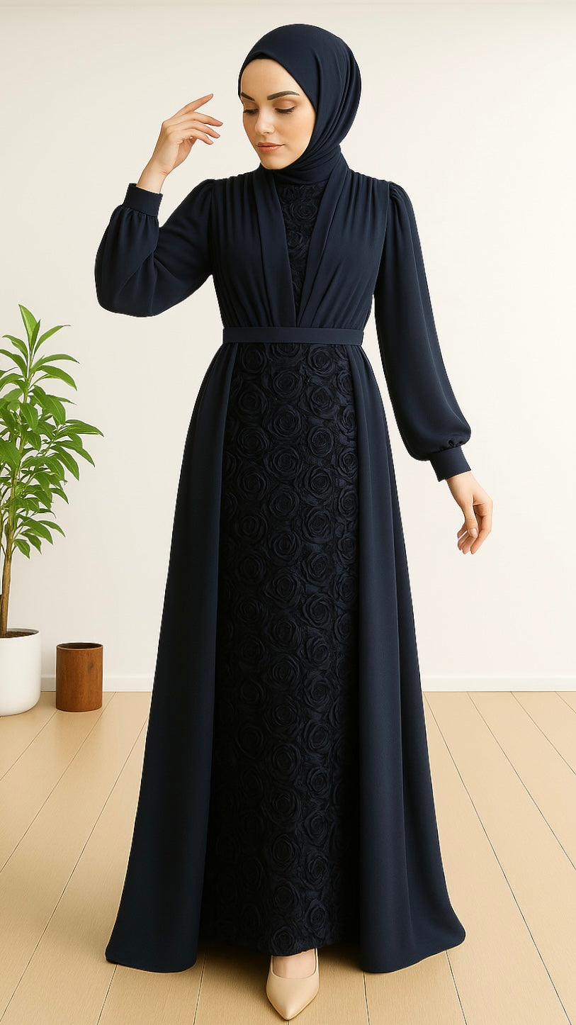 Önü Gül Detaylı Pelerinli Abiye Lacivert
