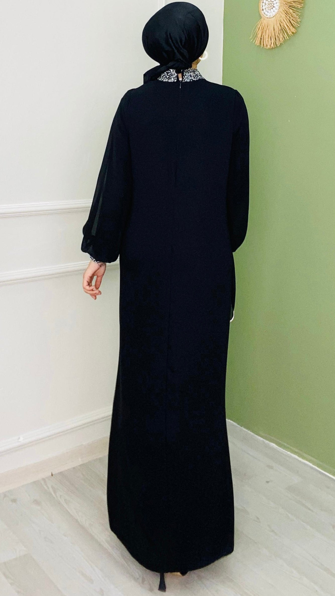 Simetrik Kesim Taş Detaylı Abiye Siyah