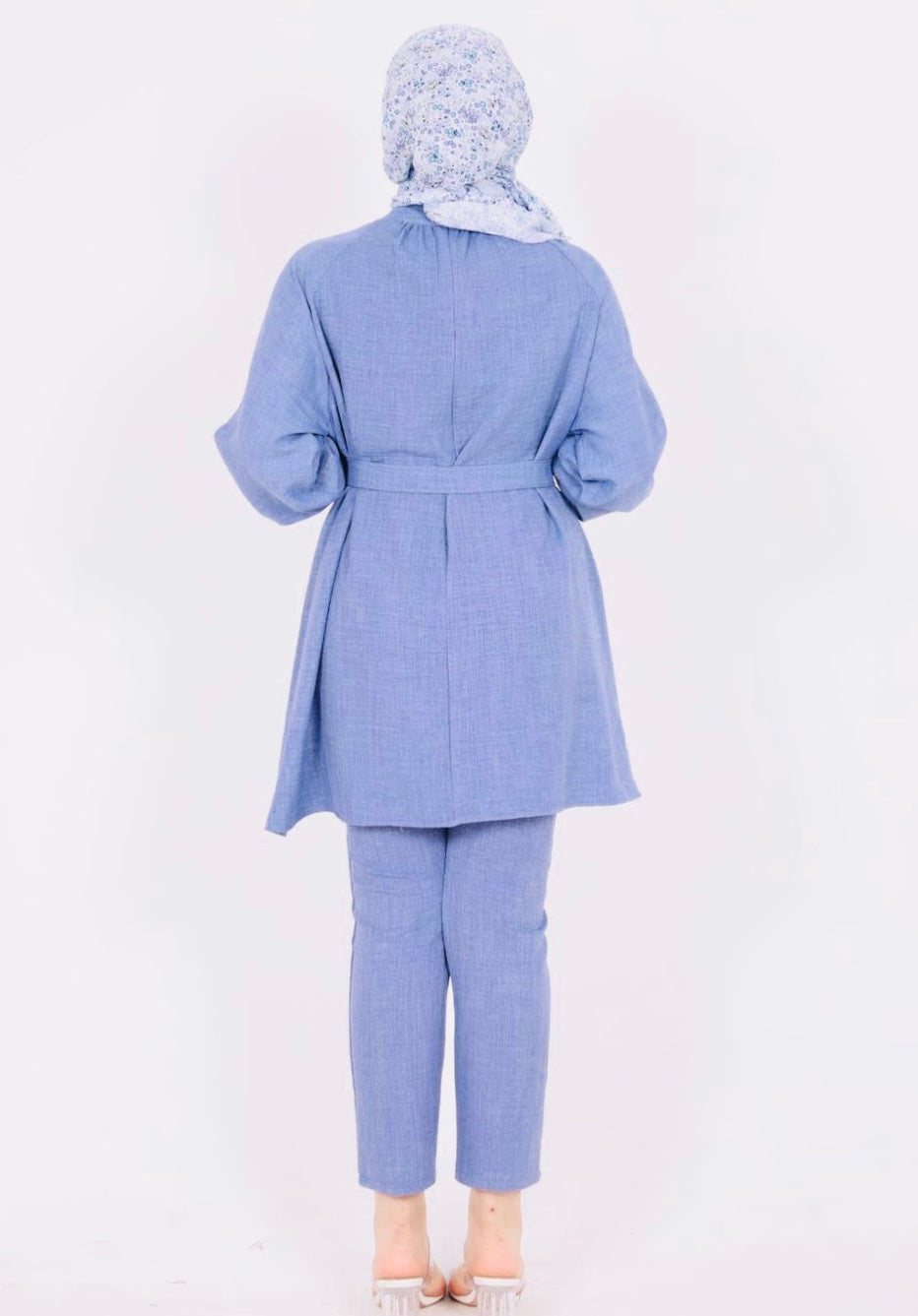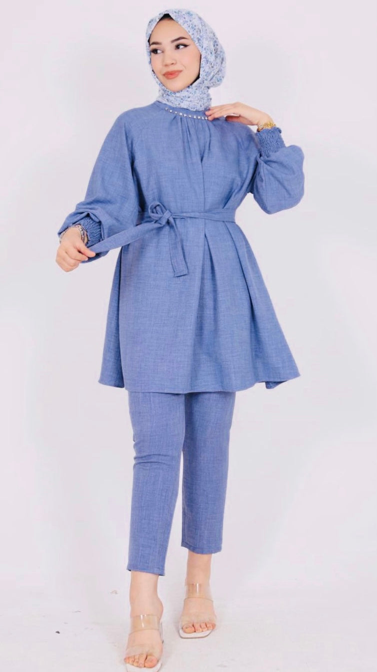 Yakası Taşlı Kuşaklı İkili Takım Mavi