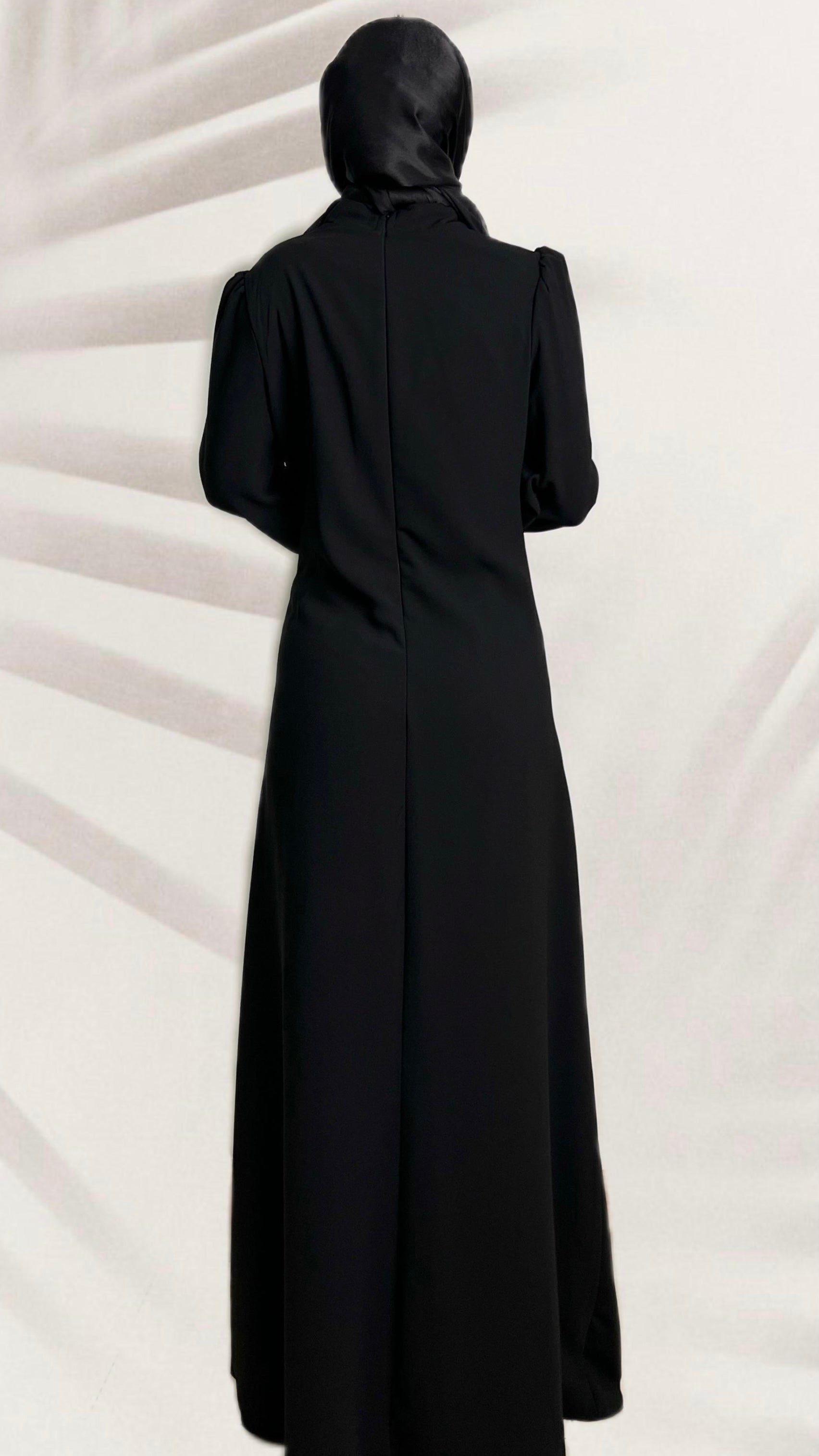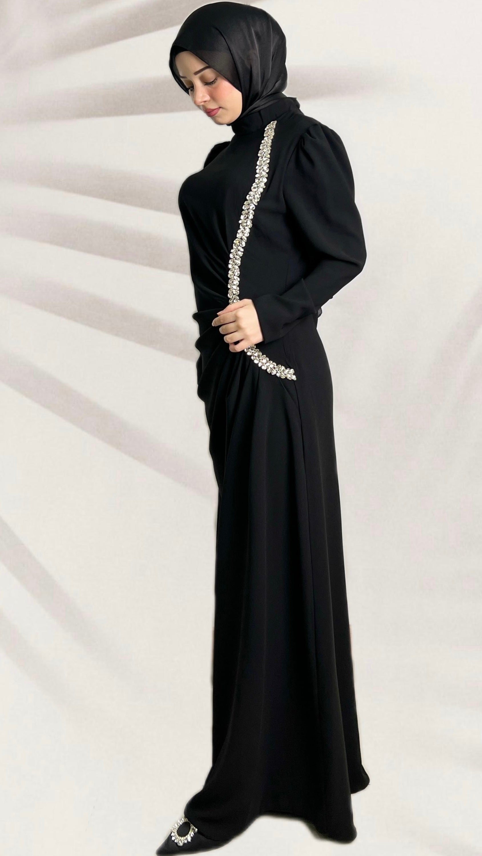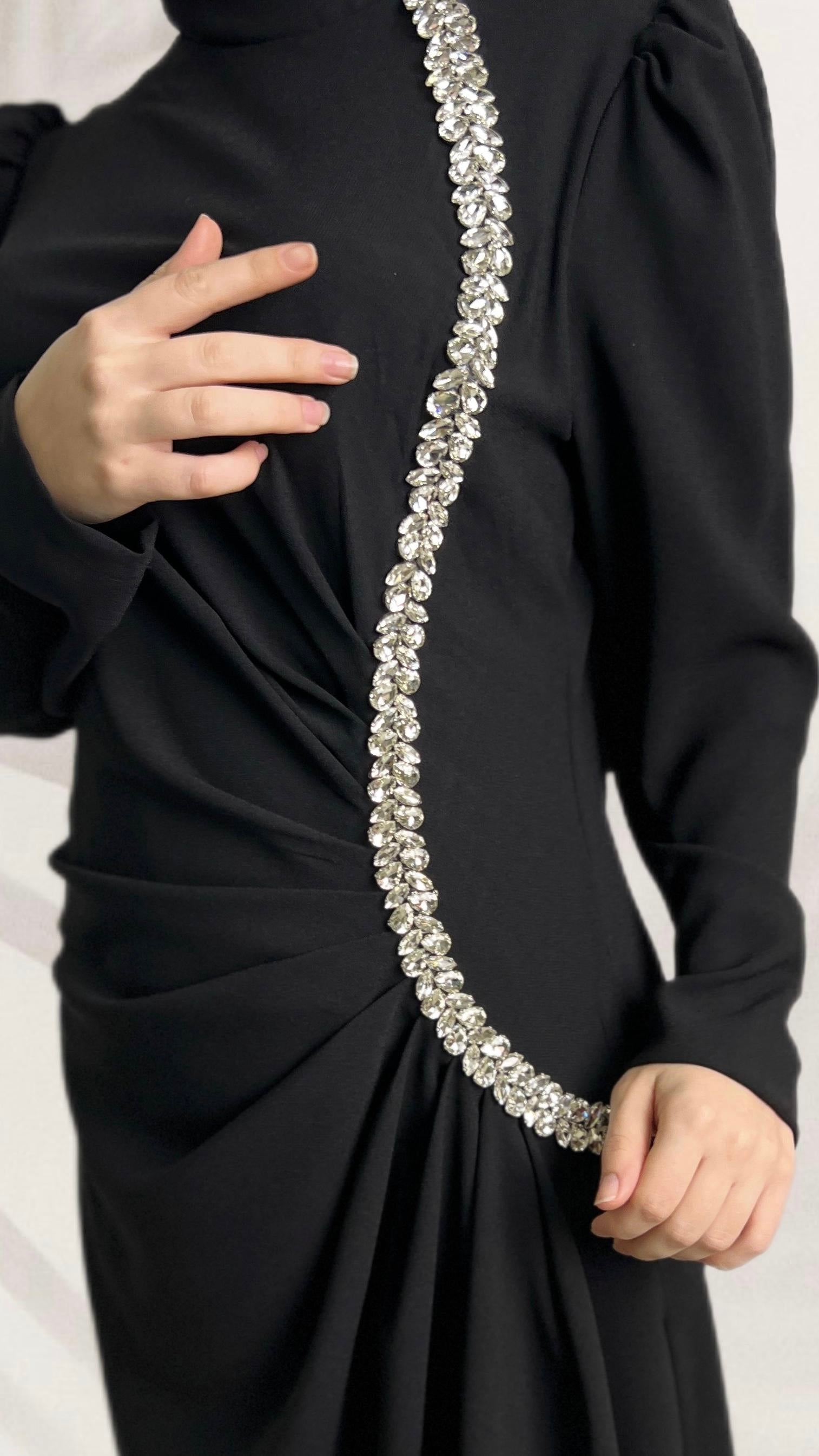 Yan Taş Detaylı Büzgülü Abiye Siyah